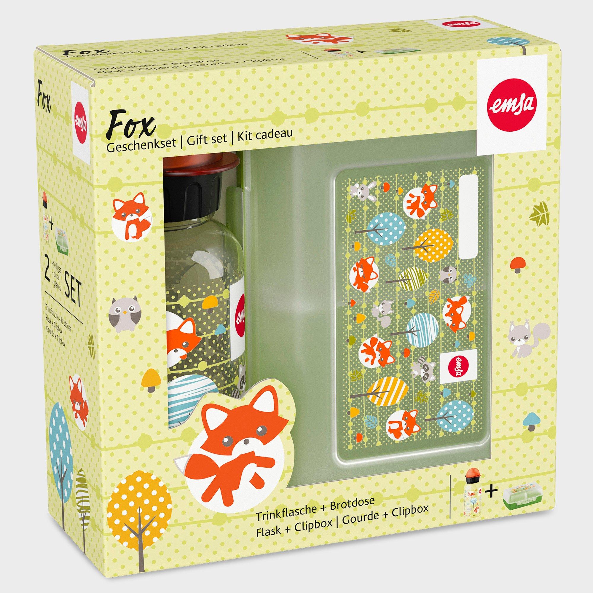 Le coffret repas Fox d’emsa contient une bouteille joliment décorée et une boîte à lunch avec une cloison amovible.