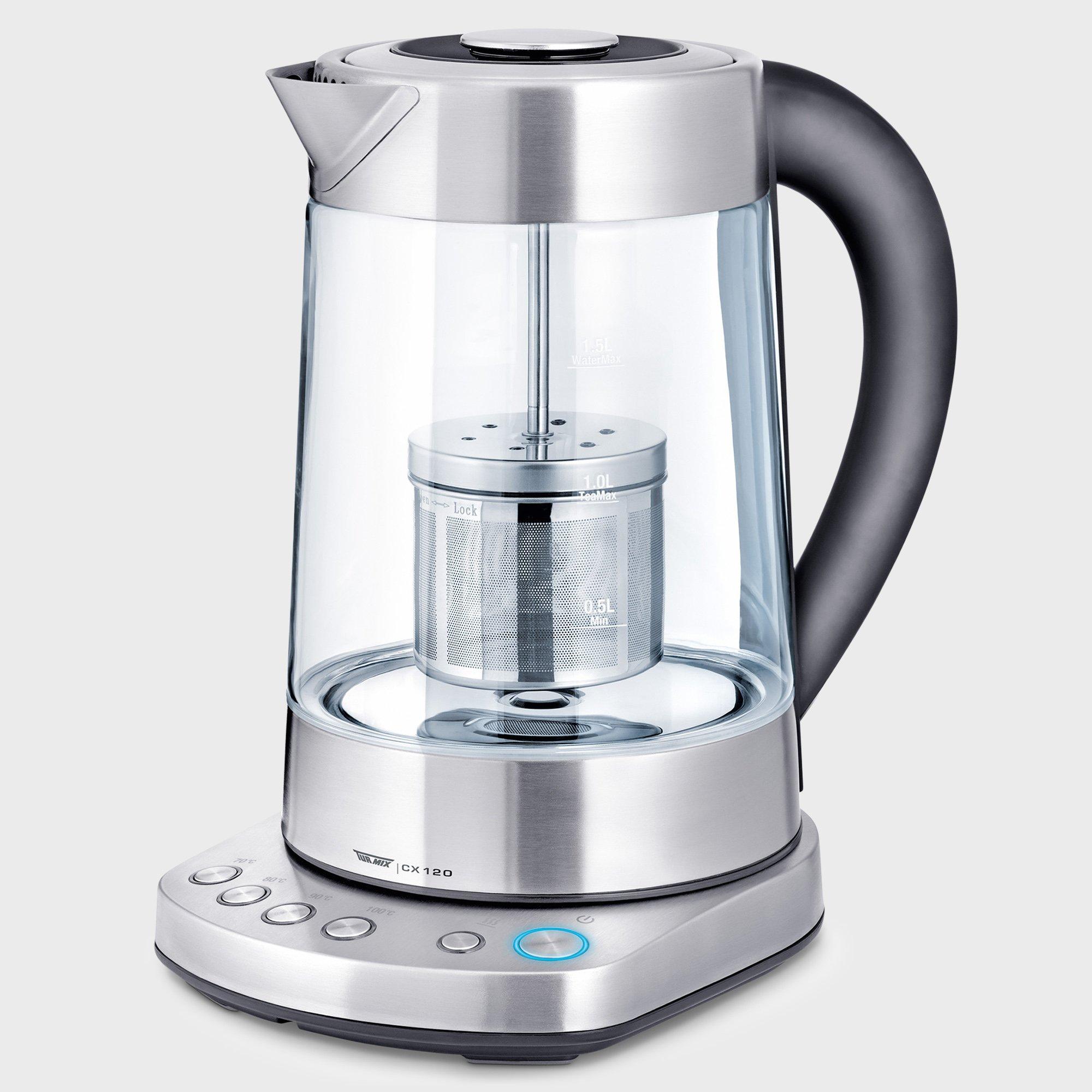 Machine à thé pour la préparation parfaite de tous les types de thé. Carafe en verre. Théière et bouilloire électrique combinées. Capacité pour le thé : 1 litre Capacité pour l'eau : 1,5 l. Sélection de la température : 70°C, 80°C, 90°C, 100°C. Fonction de maintien au chaud pendant 1 heure à 70°C, 80°C, 90°C au choix. - Réglage précis de la température, en fonction du type de thé, pour développer les arômes les plus subtils. Filtre à thé pour feuilles de thé entières qui peut être abaissé et levé manuellement. - Facile à utiliser : le temps de préparation peut être déterminé en fonction du type de thé et du goût, grande passoire à thé en acier inoxydable, amovible. - Les feuilles de thé peuvent y déployer leur arôme le plus fin.