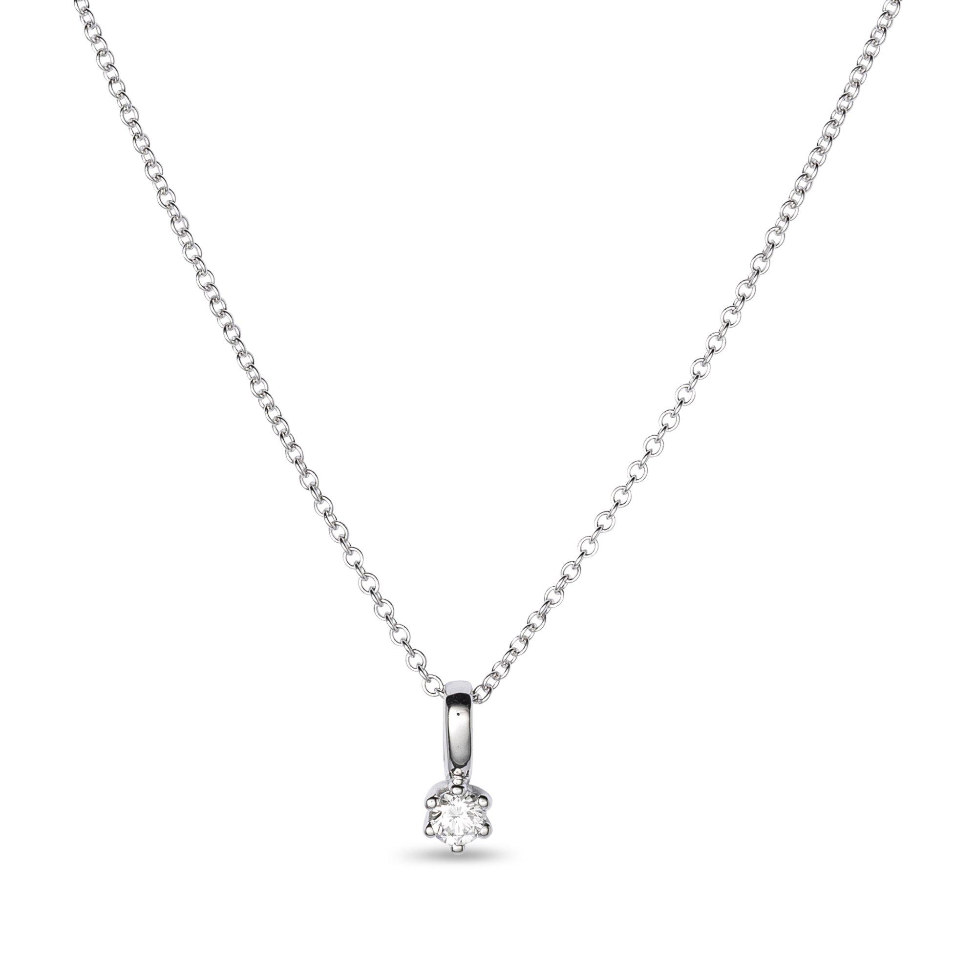 Un brillant étincelant et séduisant dans un serti griffe délicat à six sertis forme le cœur de ce collier du fabricant suisse de bijou Sergio Ferris. La chaîne à maillons filigranée se compose, tout comme le serti, d'un or blanc poli qui souligne avec style l'éclat du brillant.