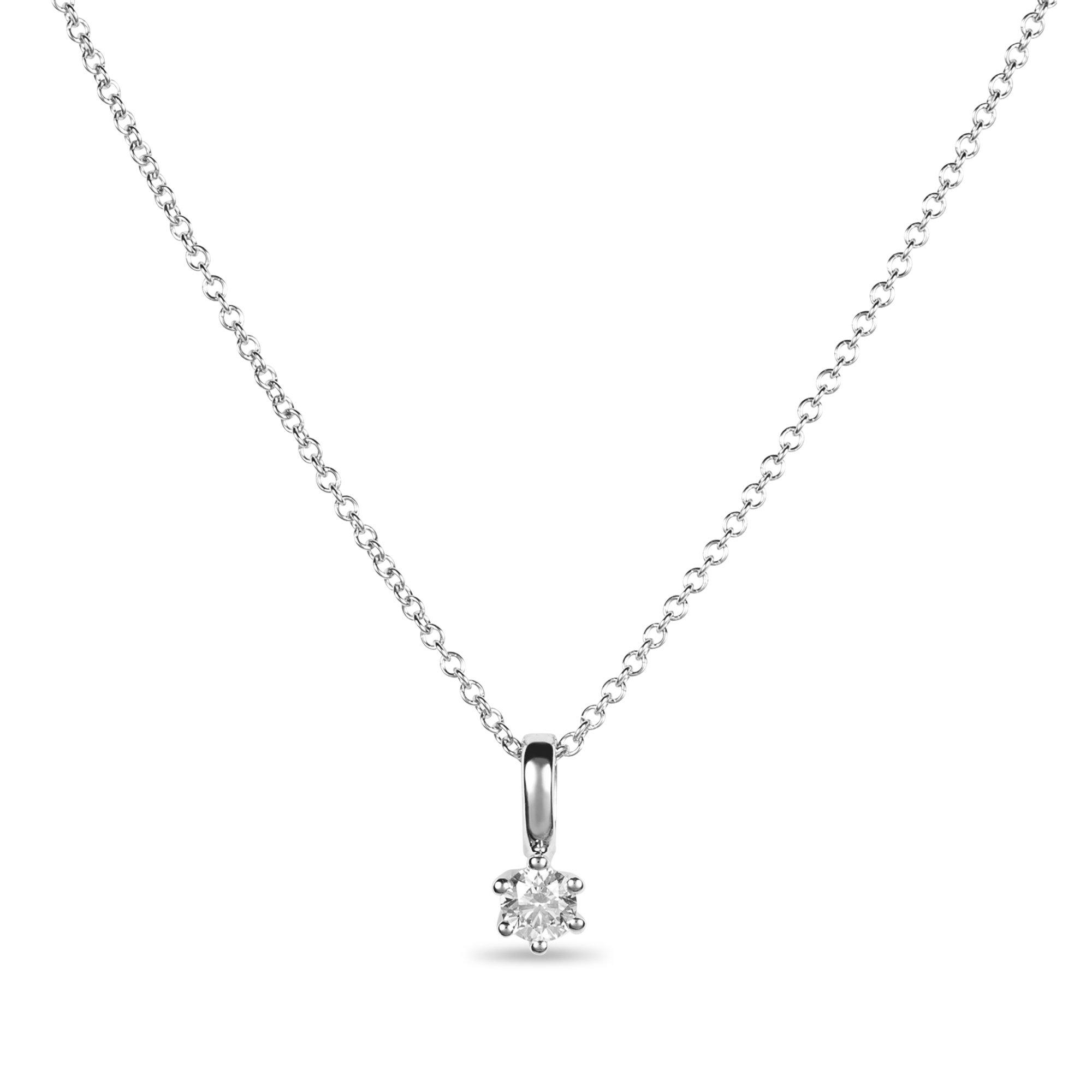 Un brillant étincelant et séduisant dans un serti griffe délicat à six sertis forme le cœur de ce collier du fabricant suisse de bijou Sergio Ferris. La chaîne à maillons filigranée se compose, tout comme le serti, d'un or blanc poli qui souligne avec style l'éclat du brillant.