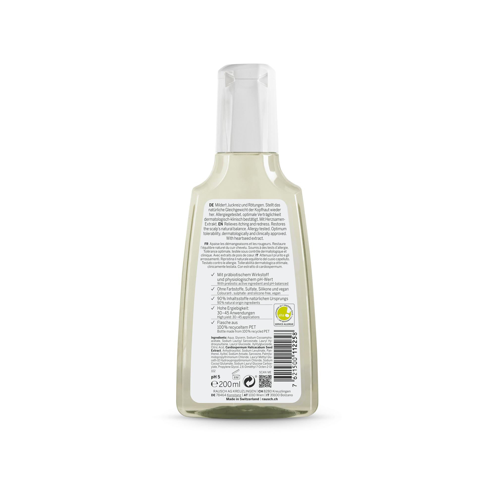 Pour élaborer ce shampooing très doux, nos développeuses ont misé sur 90 % d’?ingrédients d’origine naturelle, dont l’extrait précieux de pois de cœur. Sa formule végane et sans silicone est élaborée à Kreuzlingen, sur les rives du lac de Constance. Afin de renforcer de manière optimale la barrière cutanée, ce shampooing dispose d’un pH physiologique de 5,0 et ne contient aucun colorant. Sa tolérance a été confirmée sous contrôle dermatologique et clinique et il a reçu le label qualité aha! de Service Allergie Suisse. Afin d’assurer un lavage tout en douceur, il ne contient pas de parfum, d’où ses notes discrètes de coton et d’herbe fraîchement coupée.