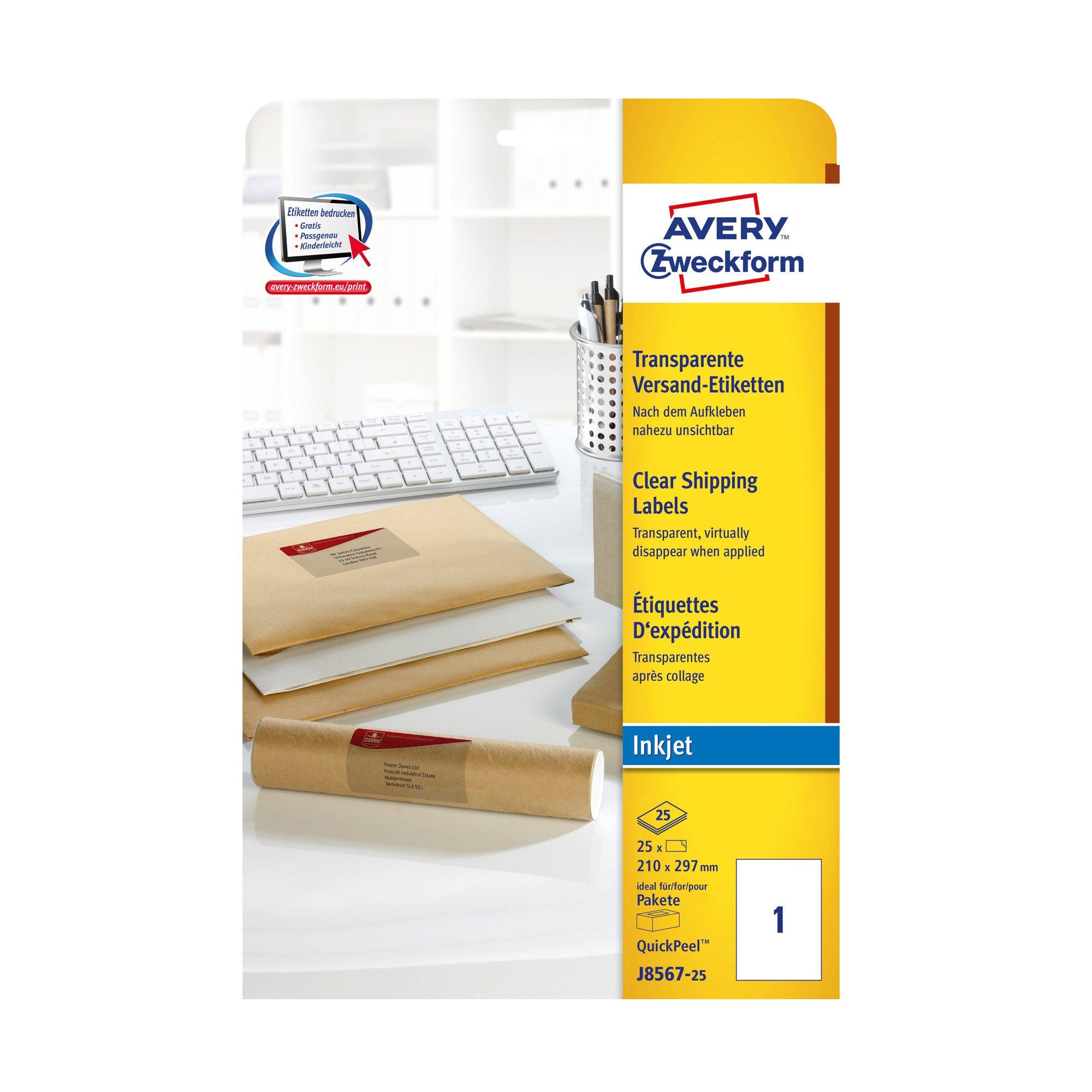 Les étiquettes d’expédition transparentes J8567-25 pour imprimantes à jet d’encre au format 210 x 297 mm d’AVERY ZWECKFORM conviennent, par exemple, à l’adressage de paquets et de colis. 25 étiquettes d'emballage sur 25 feuilles. Les étiquettes d'adresse transparentes en film de polyester sont presque invisibles après le collage. Idéales pour les enveloppes claires, l'adresse ressemble à une impression sur l'enveloppe. Vous pouvez compter sur un passage en imprimante absolument sans bourrage, sans dépôts d'adhésif dans l'imprimante. Concevez et imprimez rapidement et facilement vos autocollants pour paquets avec les modèles d'étiquettes et solutions logicielles gratuits Avery Zweckform sur le lien www.avery-zweckform.eu/print ou les modèles de base fournis avec Microsoft® Office. Décollez et collez facilement avec l'aide au retrait unique QuickPEEL ™. Conviennent à toutes les imprimantes à jet d'encre courantes.