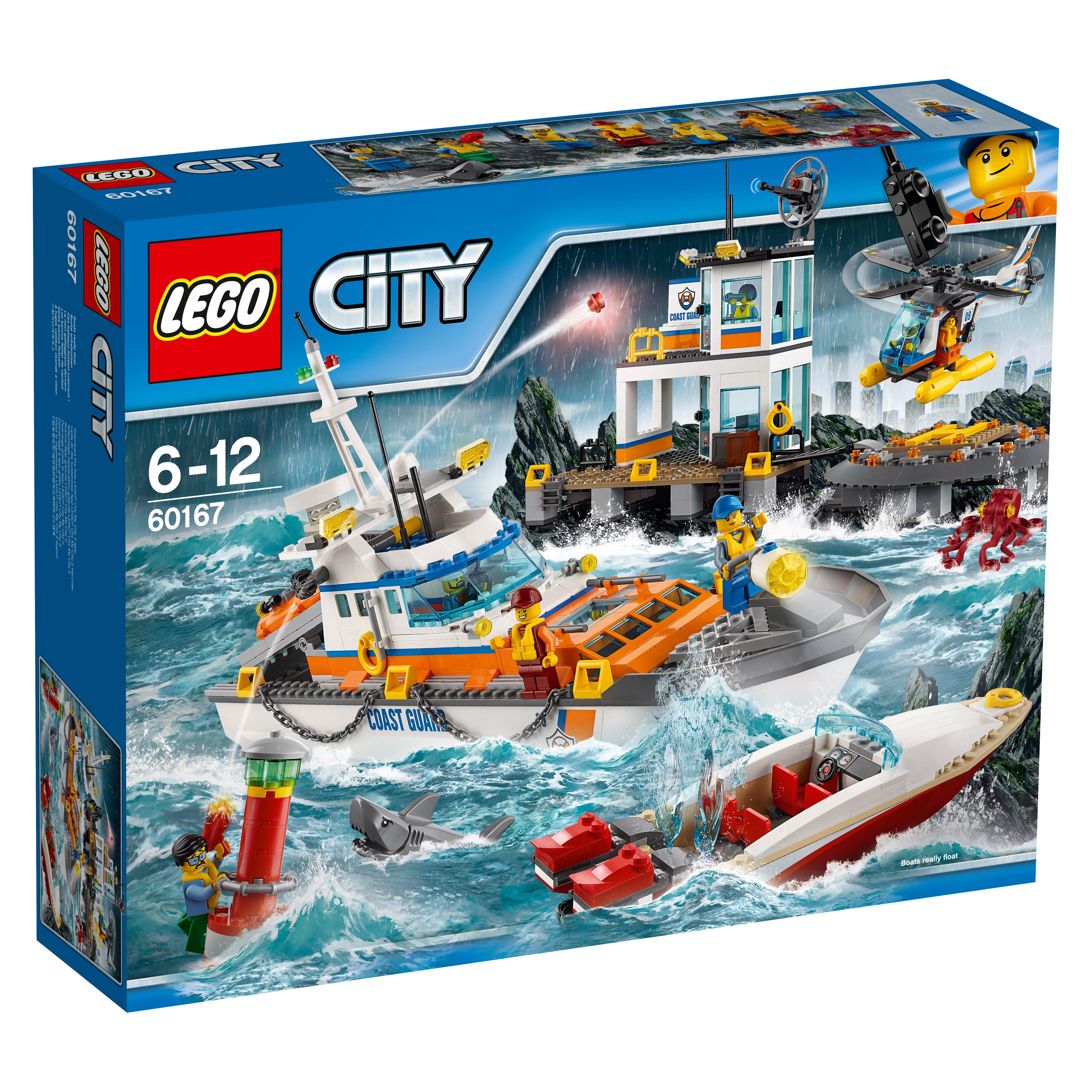L’équipe des gardes-côtes de LEGO® City est au QG des gardes-côtes. Le bâtiment comprend deux niveaux, des bureaux et une salle de contrôle radar. Il y a aussi un bateau avec un pont qui s’ouvre et un pont, un radar et un projecteur mobiles, une zone médicale et un radeau de sauvetage avec une fonction de lancement, ainsi qu'un hélicoptère avec un héliport, un hors-bord et une bouée à construire. Inclut sept figurines, plus des figurines de requin et de poulpe.