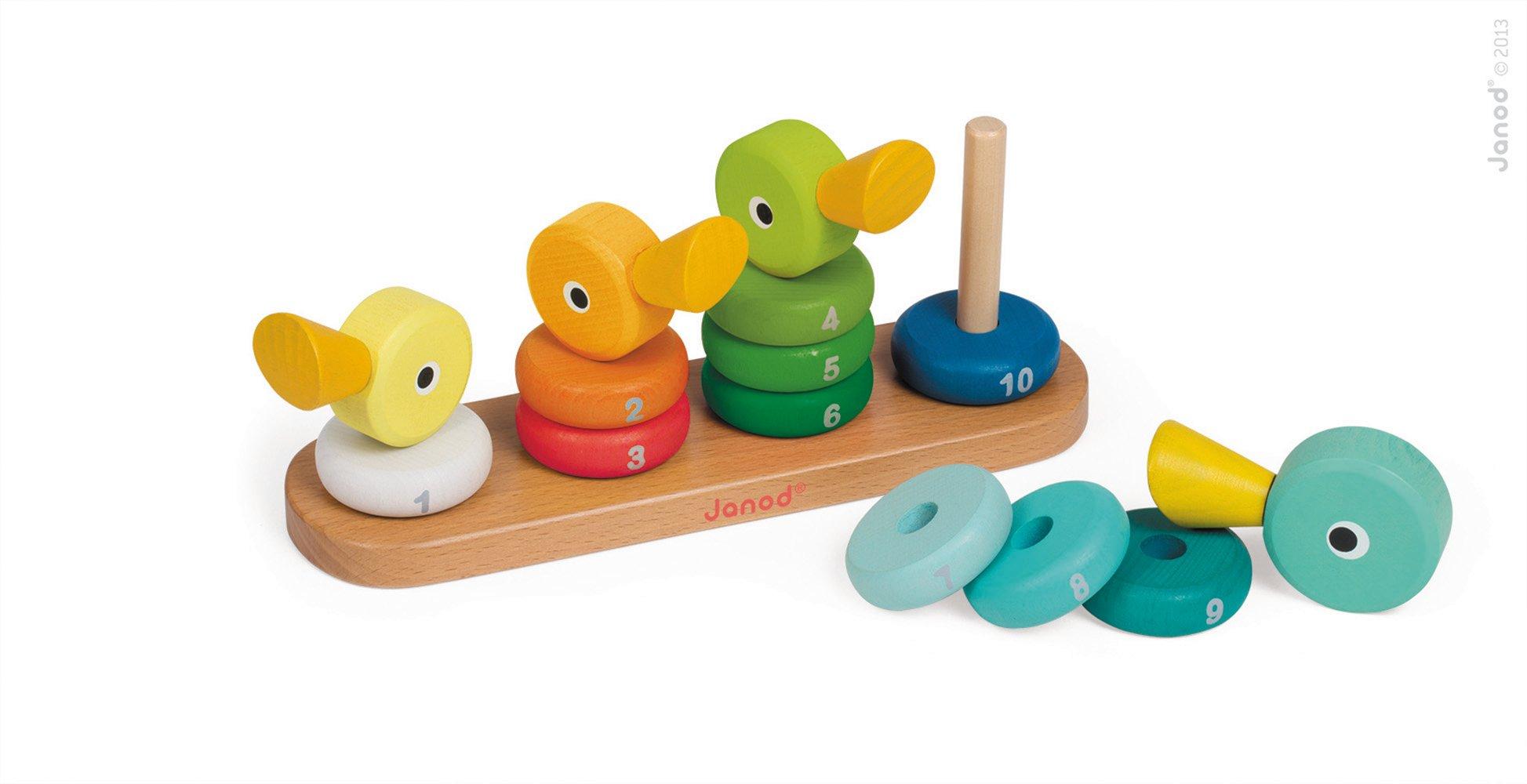 Empilable pour apprendre à compter de 1 à 10. Canards en merisier et base en hêtre. Peinture à l'eau .Tiges bois élastiques spéciales 1er Age. Boite fermée