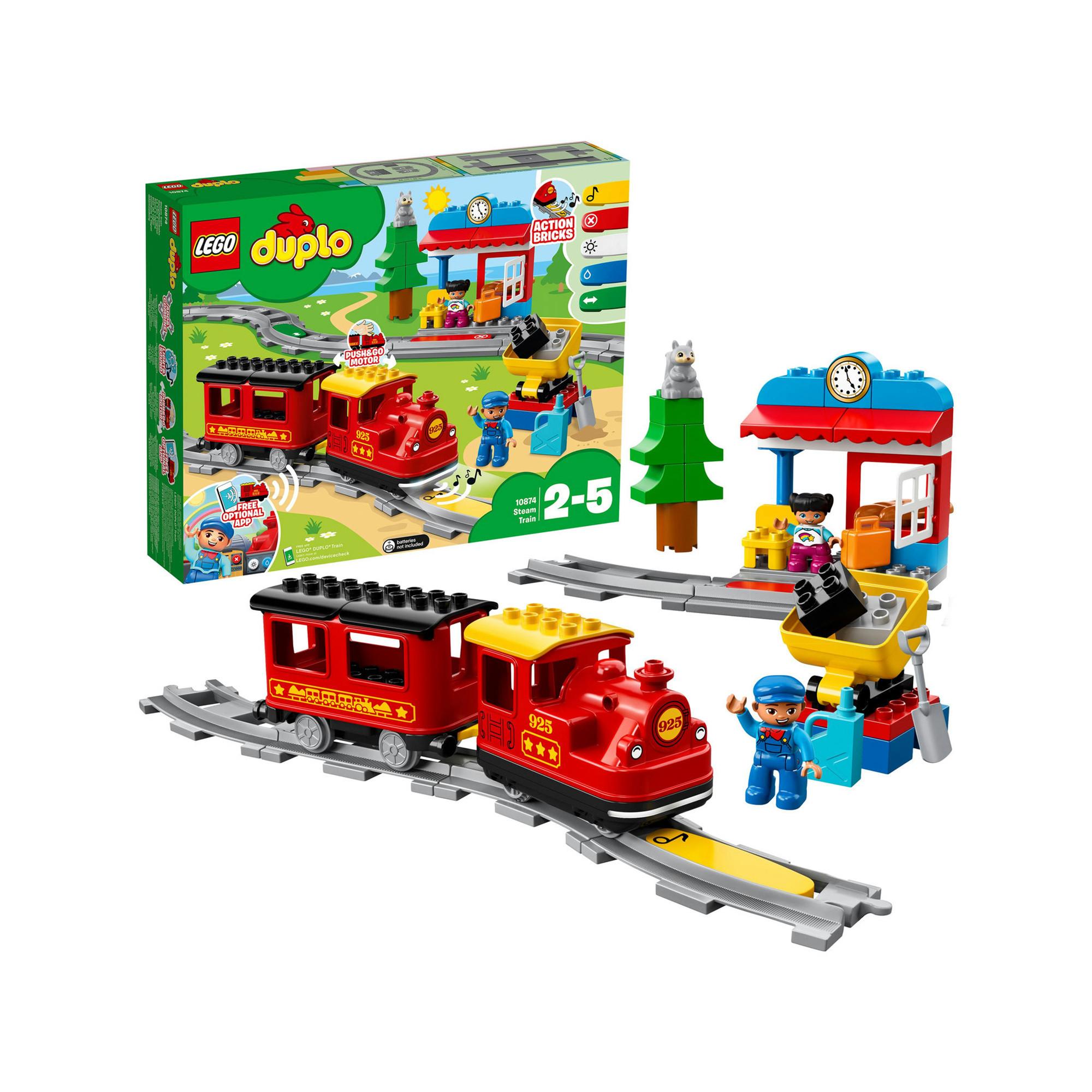 Votre enfant peut à présent contrôler et manipuler l’ensemble LEGO® DUPLO® 10874 Le train à vapeur encore plus facilement et de plusieurs manières. Les jeunes enfants peuvent incarner le conducteur du train grâce au moteur actionné par poussée : une légère pression vers l'avant ou vers l'arrière démarre le train, et pour l'arrêter, il suffit de le maintenir fermement ou de le soulever des rails. Aidez votre enfant à placer les 5 briques d'action colorées le long des rails pour déclencher le klaxon, allumer ou éteindre les phares, faire une pause pour remettre du carburant, changer de direction et arrêter le train où il le souhaite. Cet ensemble LEGO DUPLO contient aussi une gare ferroviaire, une benne basculante à charbon, 2 figurines DUPLO ainsi qu'une figurine d'animal et des rails simples pour permettre aux tout-petits d'inventer des jeux sur le thème intemporel des trains. Téléchargez l'application (optionnelle) pour accéder à bien d'autres possibilités de jeu, y compris une fonction télécommandée et des activités amusantes à réaliser avec votre enfant !