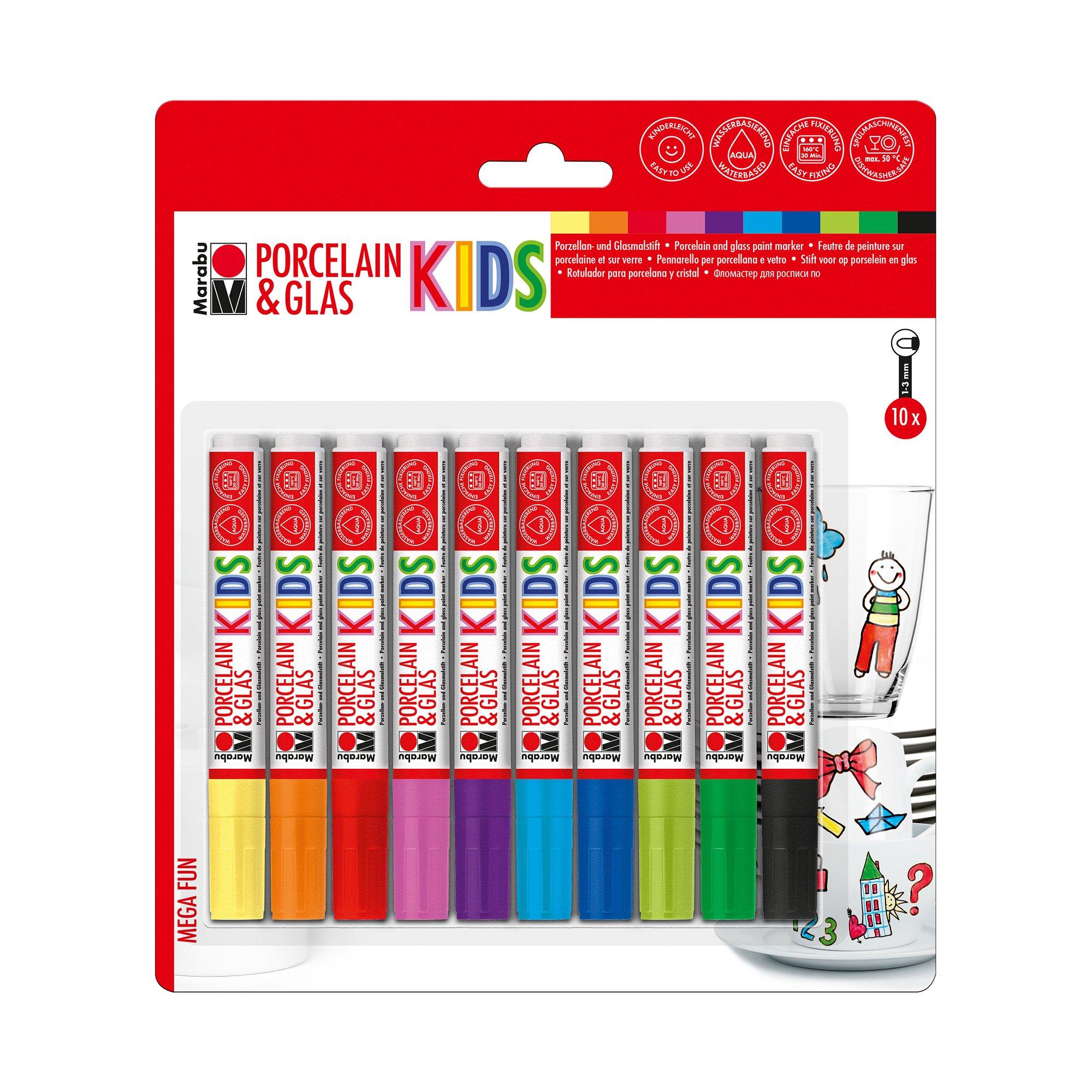 Marqueurs en porcelaine et verre pour enfants. Idéal pour une application facile sur la porcelaine et le verre. • À base d'eau • Sans odeur • Lavable au lave-vaisselle après cuisson • Ensemble avec 10 stylos de couleurs différentes