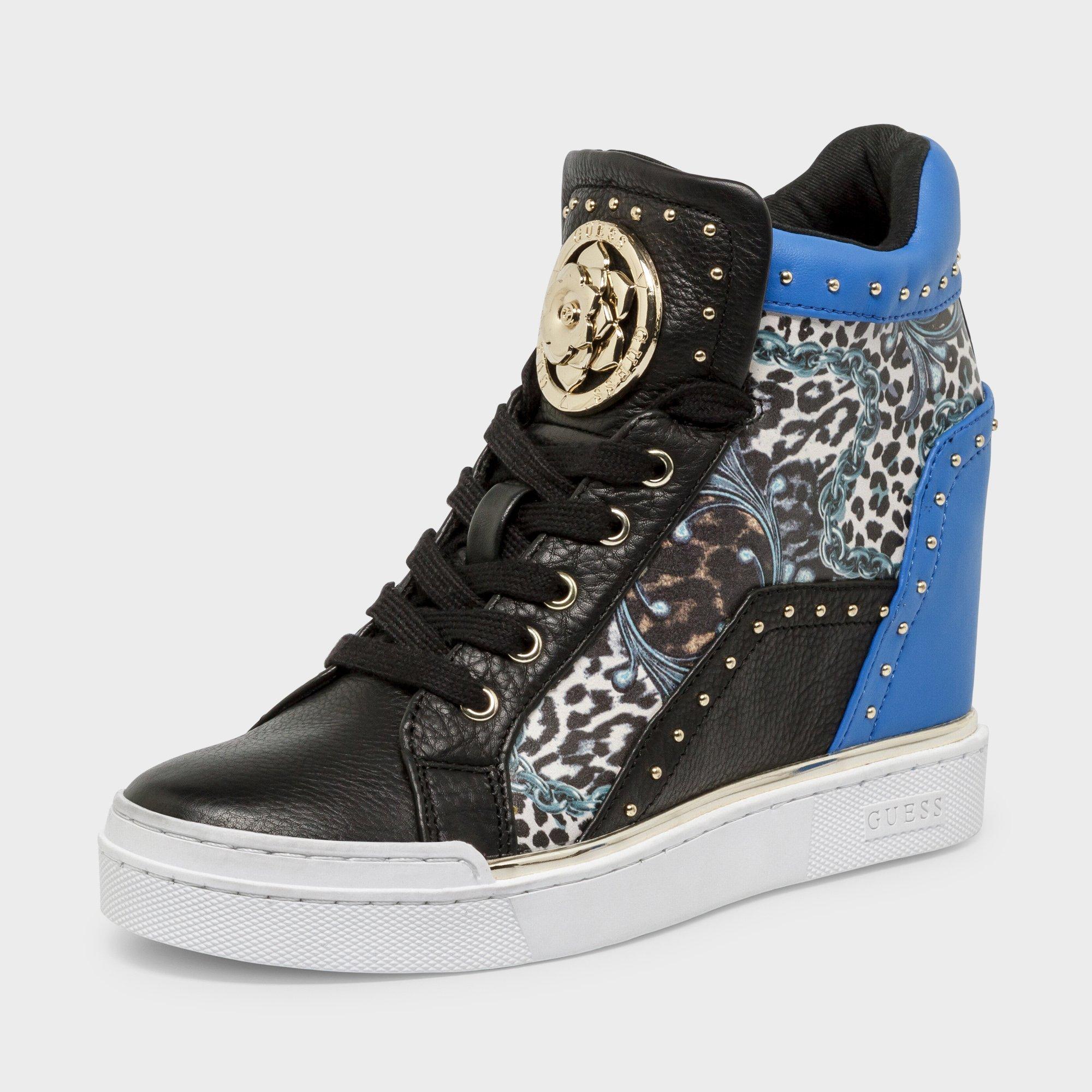 De nombreux petits rivets et un motif innovant donnent son design unique à cette basket haute de Guess.