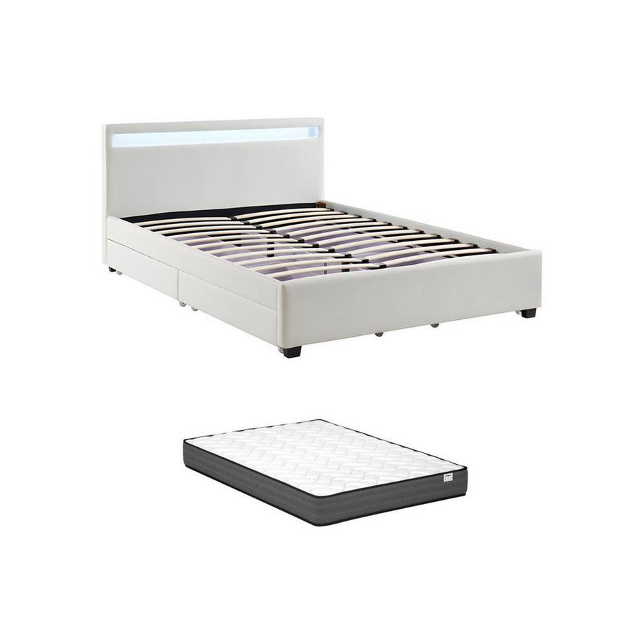 Vente-uniqueLit 140 x 190 cm avec rangements - Simili blanc avec LEDs + Matelas - ALOIS II