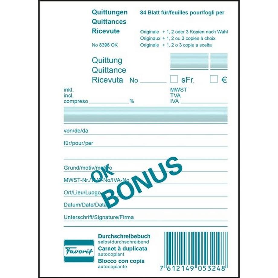 FavoritFAVORIT Quittungen OK BONUS D/F/I A6 8396 OK Durchschreibepapier 84 Blatt
