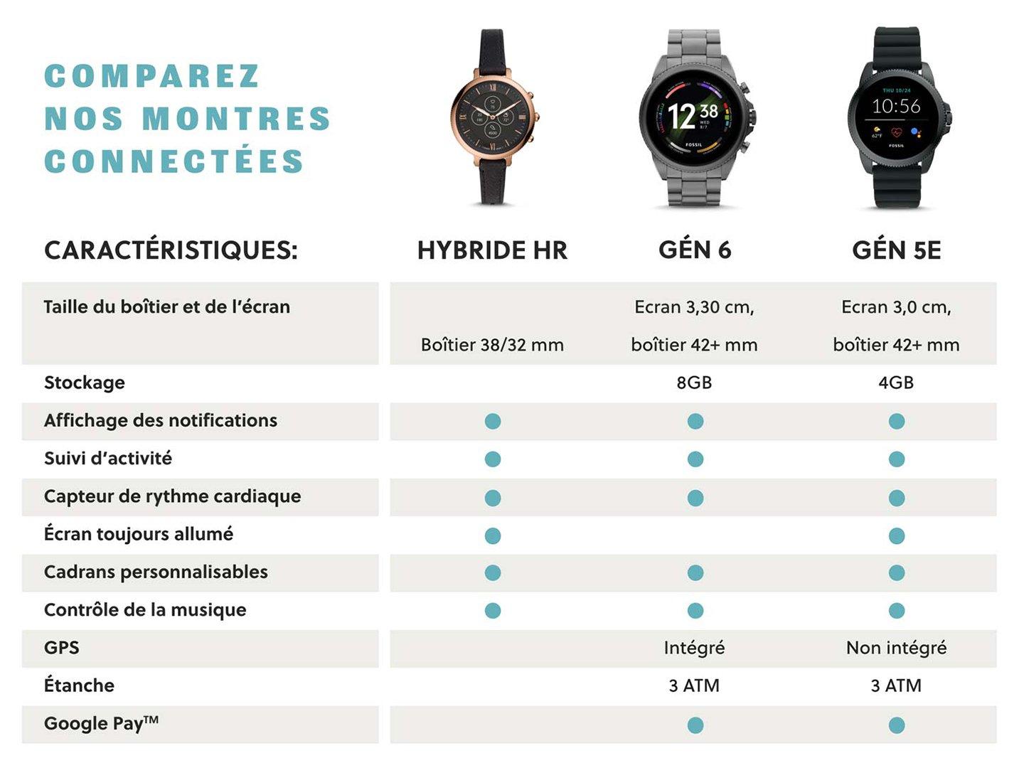 La montre connectée la plus rapide et la plus avancée de Fossil. Des performances à la pointe de l’industrie Avec la plateforme Snapdragon Wear 4100+, les performances ont augmenté de +30 %<em> avec un chargement plus rapide des applications, un processeur plus rapide et une consommation d’énergie plus faible. </em>par rapport aux montres connectées GÉN 5 La GEN 6 avec Google vous aide à tirer le meilleur parti de votre temps. Gérez les tâches quotidiennes, planifiez votre journée, obtenez des réponses à vos questions.