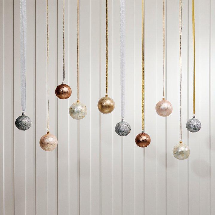 Des oiseaux, des fleurs, des boules marbrées et des paillettes argentées viennent rejoindre les boules classiques pour créer un sapin de Noël généreux. Ajoutez une touche fastueuse en utilisant des rubans de velours pour attacher ces petites merveilles.