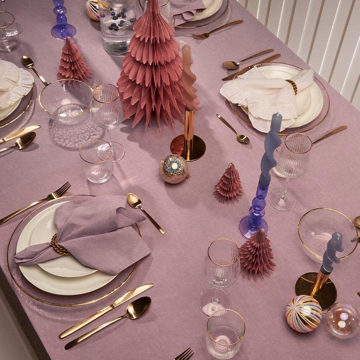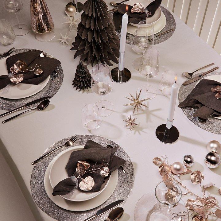 Un style élégant qui séduit par sa délicatesse et son éclat. Une dominance de blanc, de gris, de rose et de tons argentés et champagne confère à votre table de fêtes une touche raffinée. Et pour créer un joli contraste, optez pour une vaisselle plutôt sobre.