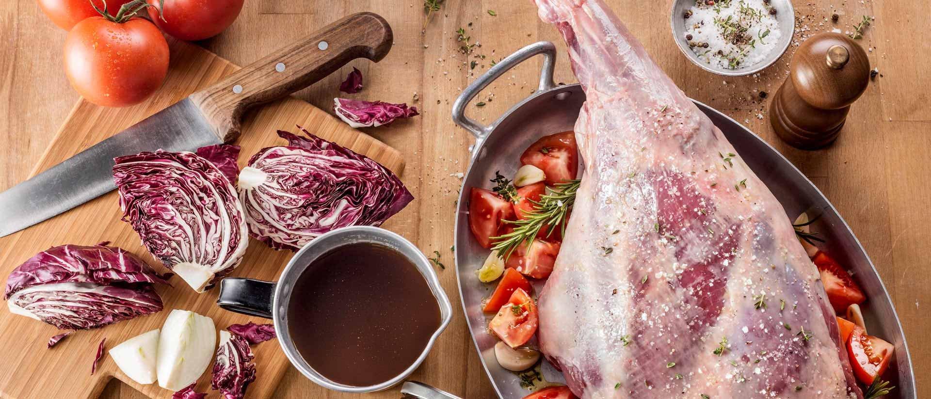 Gigot d’agneau braisé accompagné d’une sauce à la tomate et à l’ail et de pommes de terre au romarin
