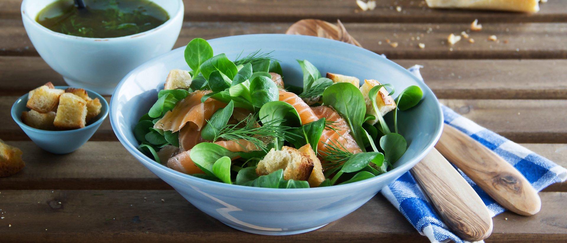 Salade de rampon avec croûtons et saumon sauvage