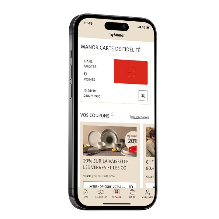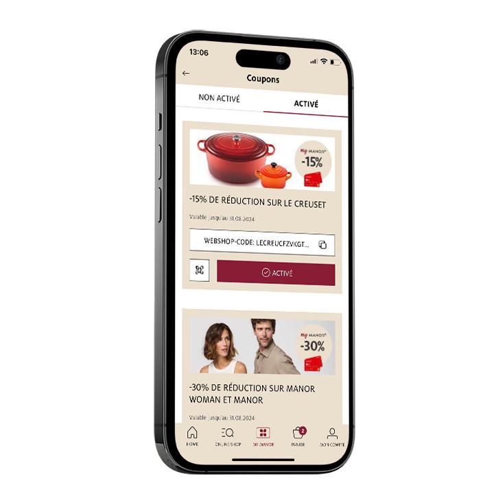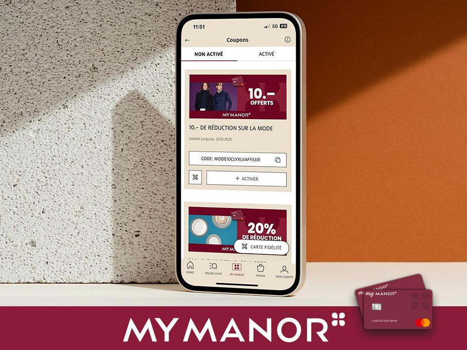 Recevez chaque mois des coupons intéressants sur l’application Manor et utilisez-les en magasin ou en ligne. En exclusivité avec la carte Manor.