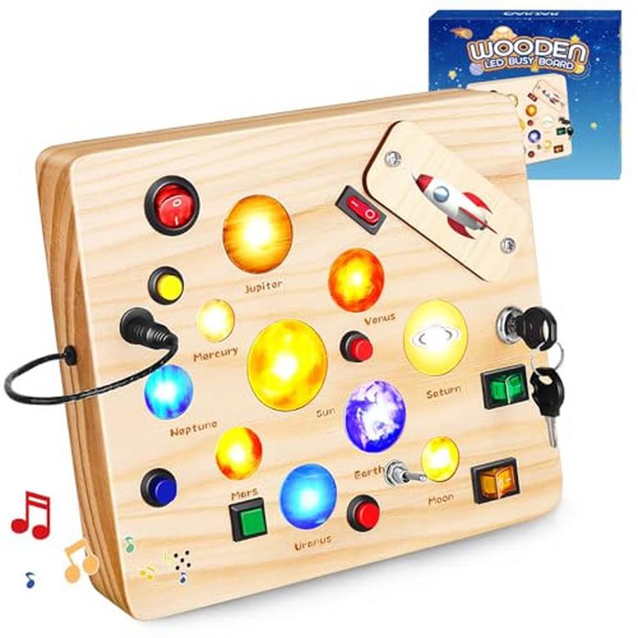 Activity-boardBusy Board Spielzeug, Activity Board Holzspielzeug mit 12 Schaltern, 10 LED Lichtern und Kleinkind-Motorikspielzeug für Babys