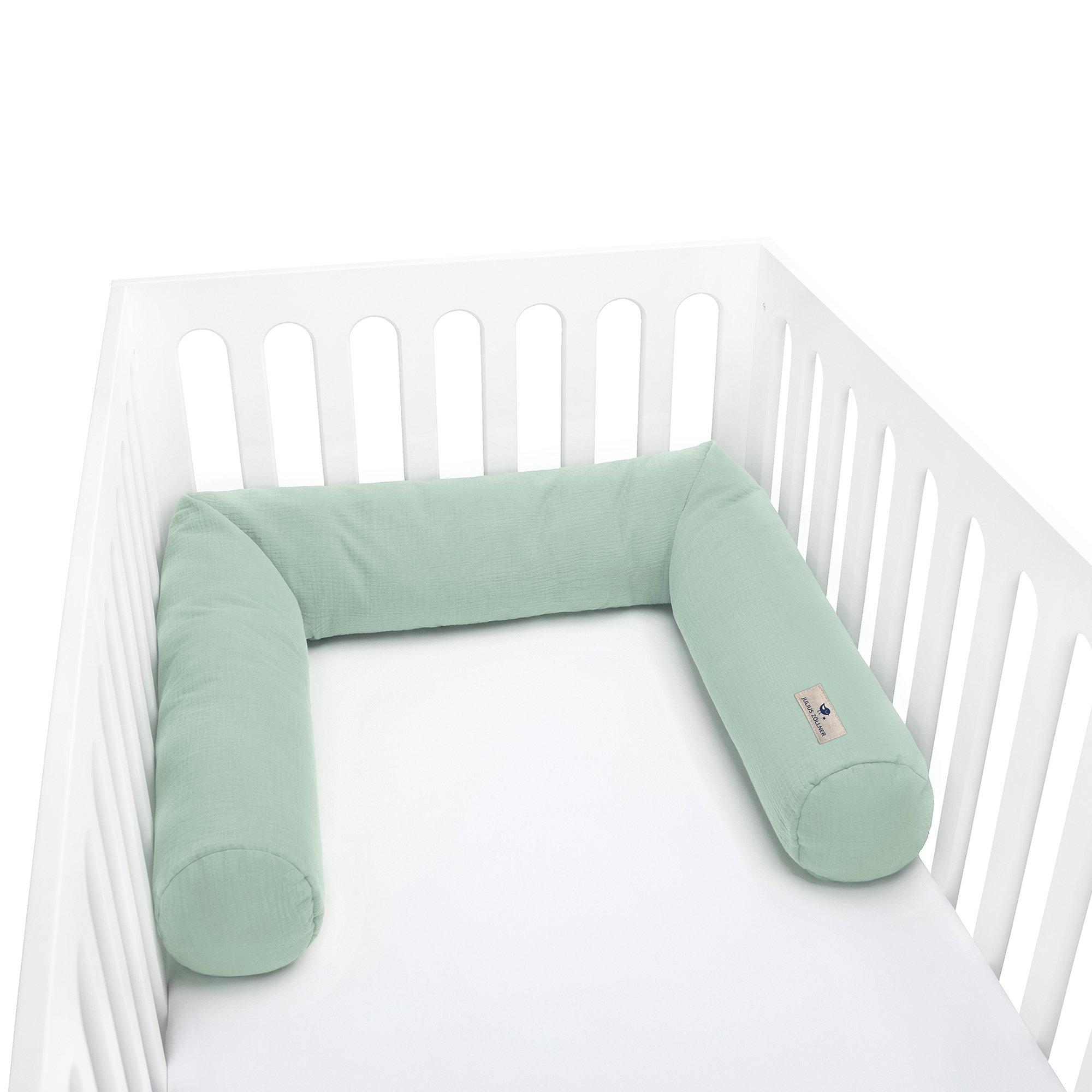 Il nido realizzato in mussola di cotone meravigliosamente morbida e un'imbottitura in pile di poliestere traspirante può essere fissato individualmente al lettino con lacci e protegge così la testa del bambino da sbarre e correnti d'aria. Dimensioni: circa 180 x 35 cm lavabile a 30°C con ciclo delicato. Prodotto testato per sostanze nocive secondo lo Standard 100 da OEKO-TEX®. Vero artigianato tedesco.