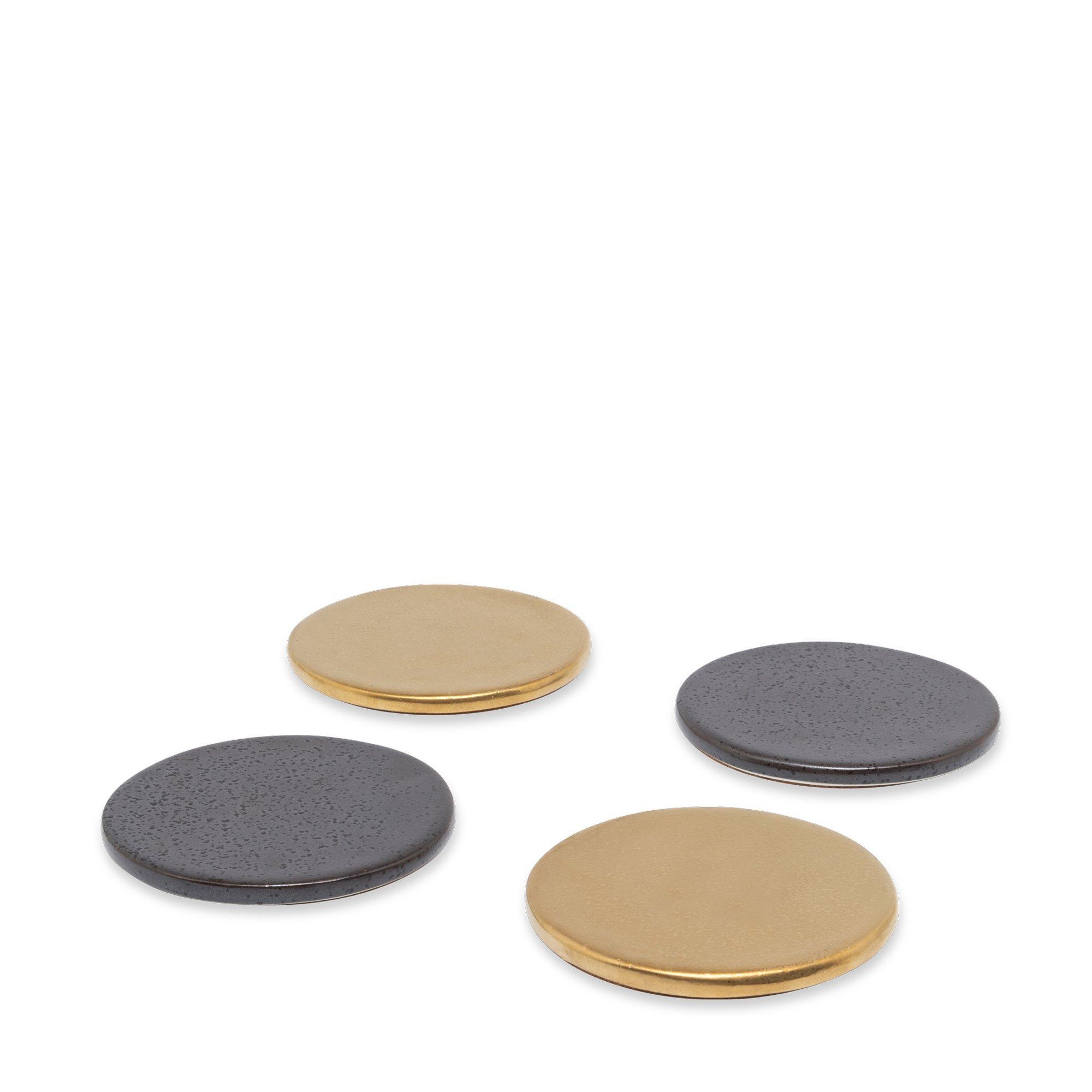 Un set di 4 sottobicchieri di vetro in ceramica di MANOR, dotati di sughero sul lato inferiore. Sono leggermente lucidi e hanno una struttura puntuale irregolare.