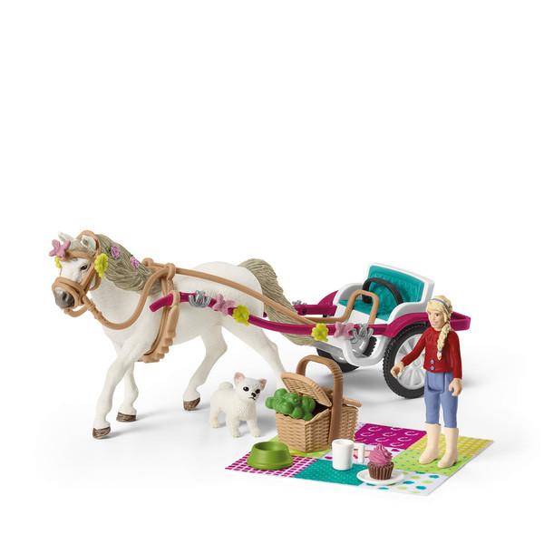 La carrozza per lo spettacolo ippico Schleich® Horse Club è amorevolmente decorata con foglie di trifoglio, ferri di cavallo e farfalle. Clara ha anche attaccato bellissimi elementi decorativi alla cavezza del suo pony del Connemara. Una morbida coperta da picnic e una valigetta da picnic ben riempita sono riposte sul pratico piano di appoggio. Così Clara può sedersi comodamente sulla coperta durante lo spettacolo ippico, coccolare il suo cucciolo di chihuahua e sgranocchiare dal cestino.
