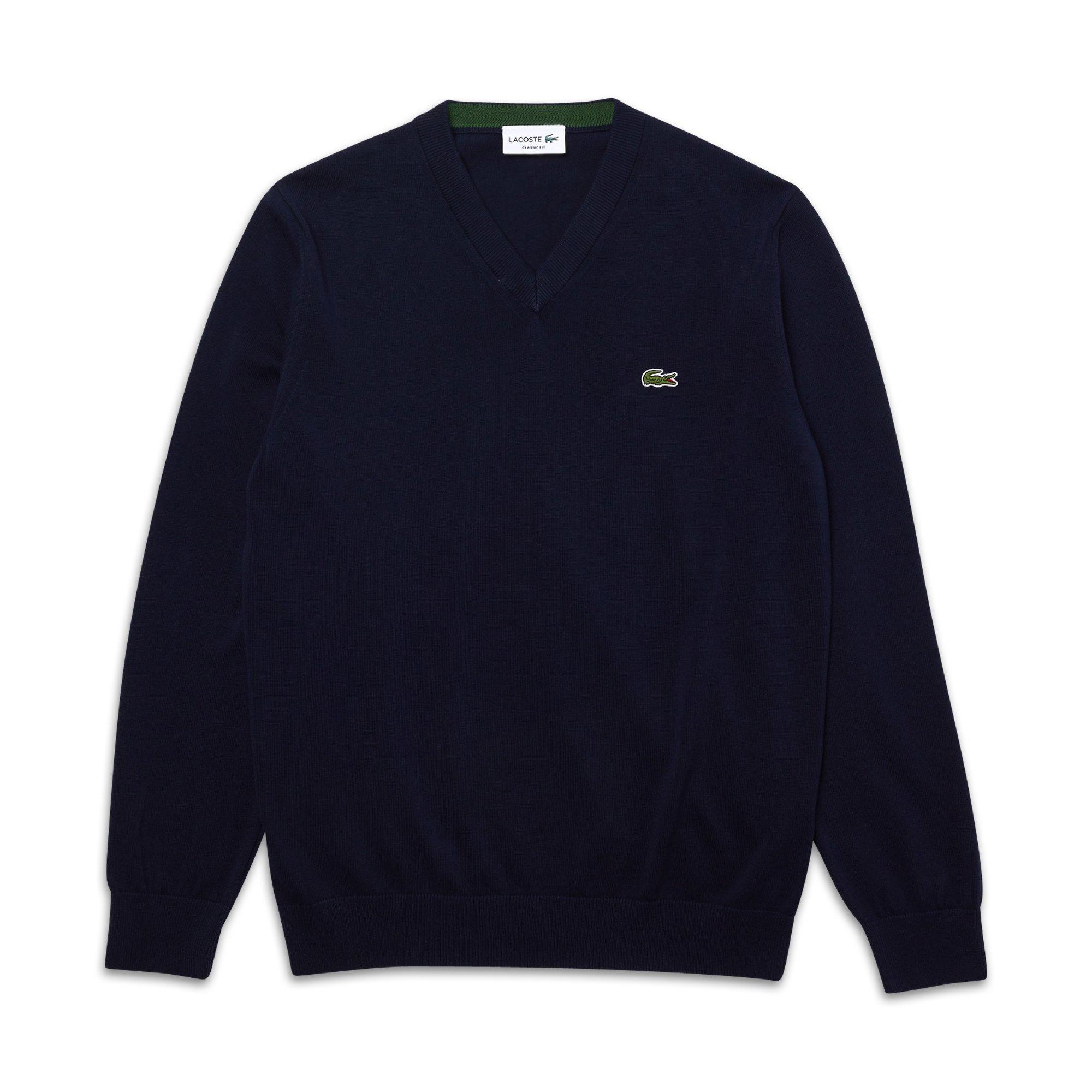 L'elegante maglione è realizzato in cotone biologico e ha uno scollo a V. Il pullover ha dettagli a contrasto sull'interno collo e sulla manica destra.