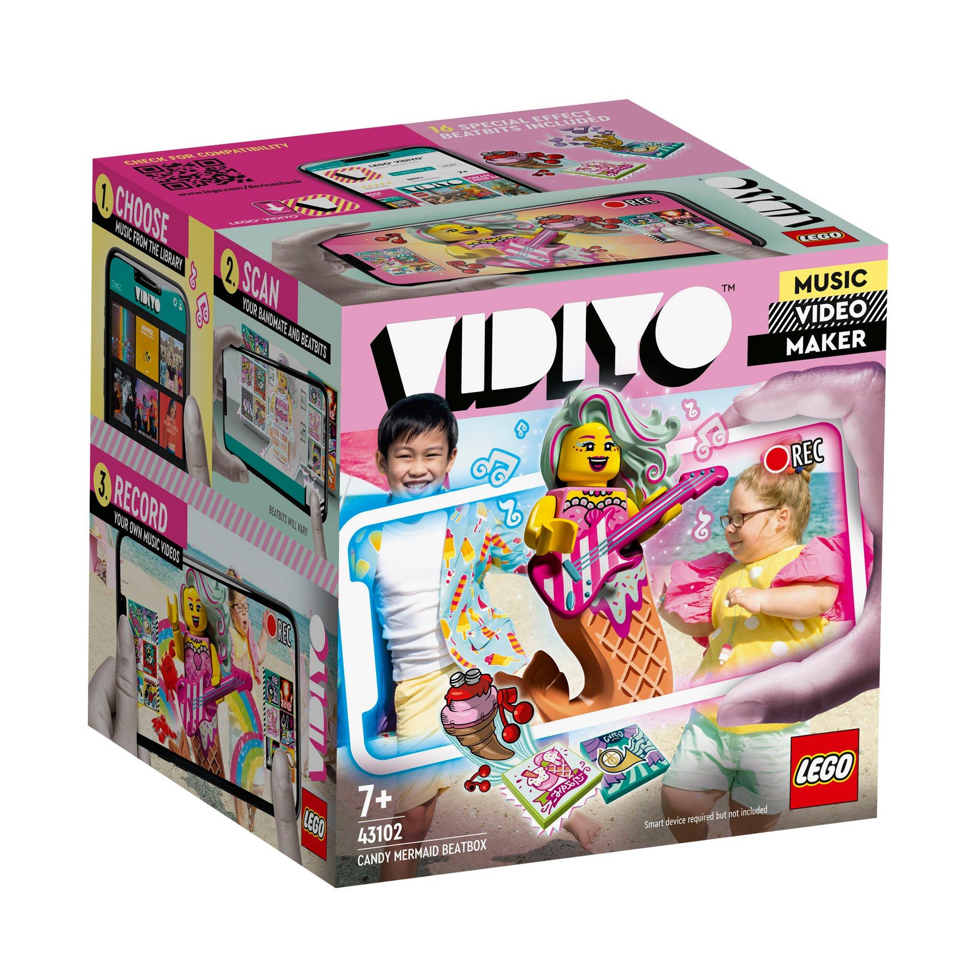- Incoraggia i bambini a dirigere e interpretare i loro video musicali con LEGO® VIDIYO™ Candy Mermaid BeatBox (43102). Il set include la minifigure di una sirena con chitarra, 14 BeatBits casuali e 2 BeatBits speciali.