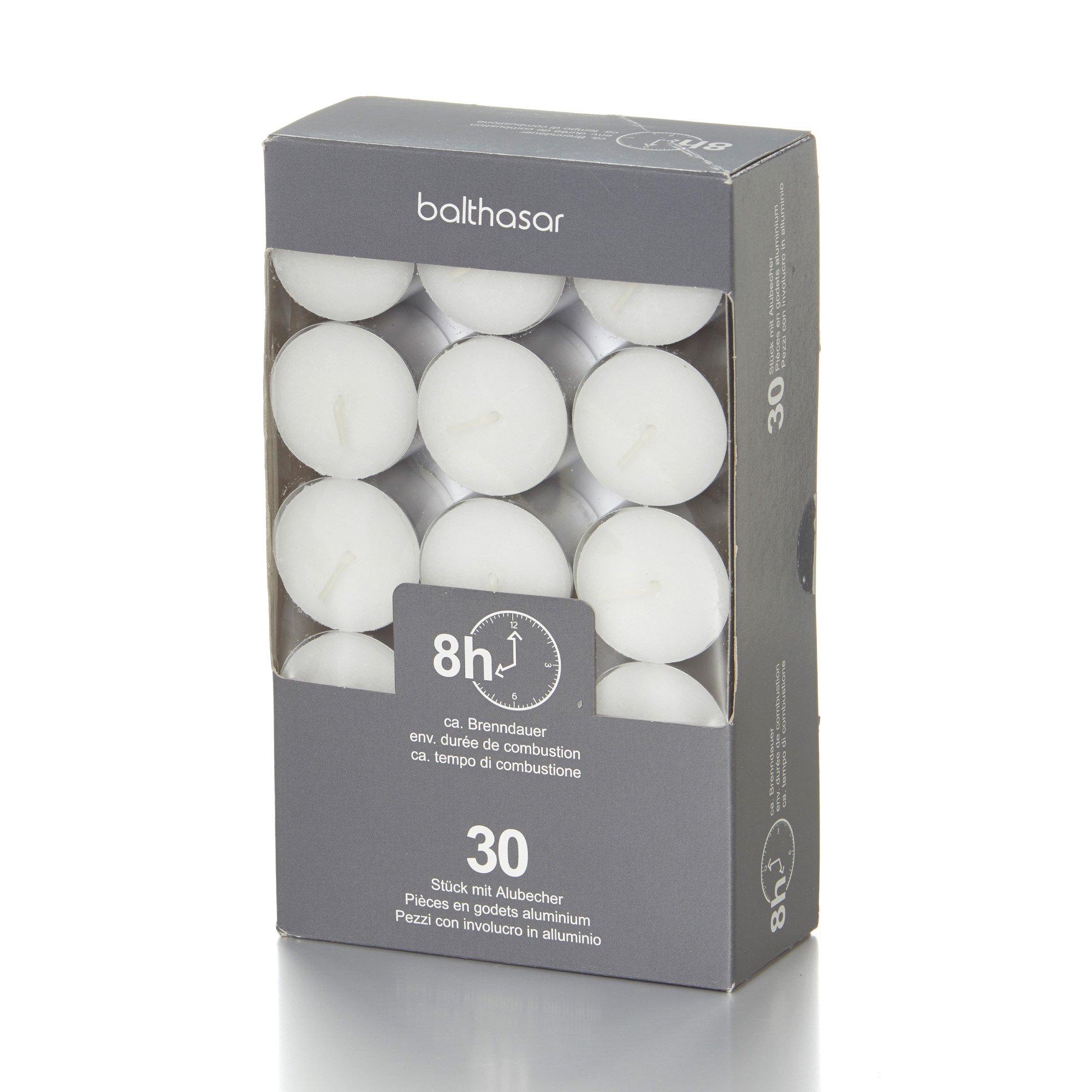 I lumini firmati Balthasar appartengono a ogni famiglia. Come piccoli richiami visivi pratici e sicuri, abbelliscono la tua casa con facilità. Il set contiene 30 pezzi, realizzati in cera e alluminio in bianco, con un tempo di combustione di 8 ore. Dimensioni: 3,8 x 2,4 cm.