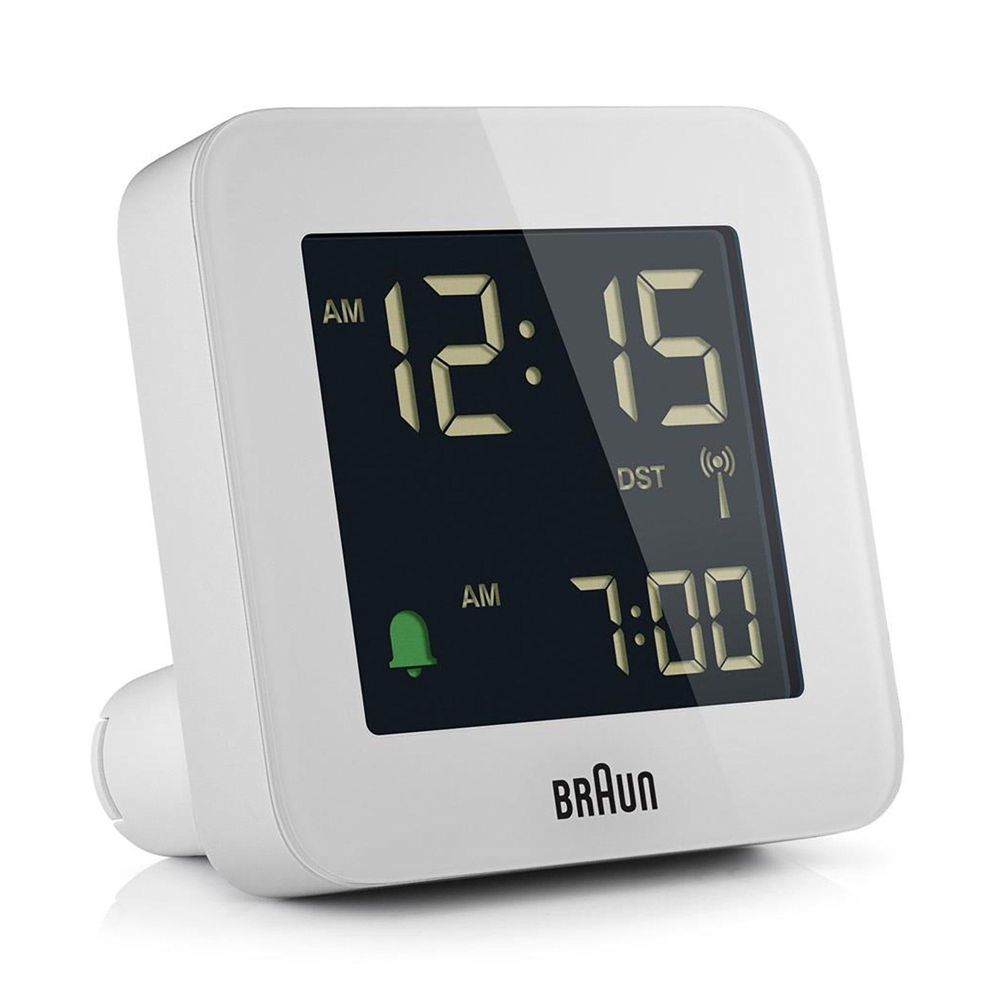 Sveglia digitale LCD reversibile radiocontrollata globale con retroilluminazione 10 secondi. Lo schermo mostra ora corrente e ora della sveglia. Posponi. Funzione 12/24 ore.