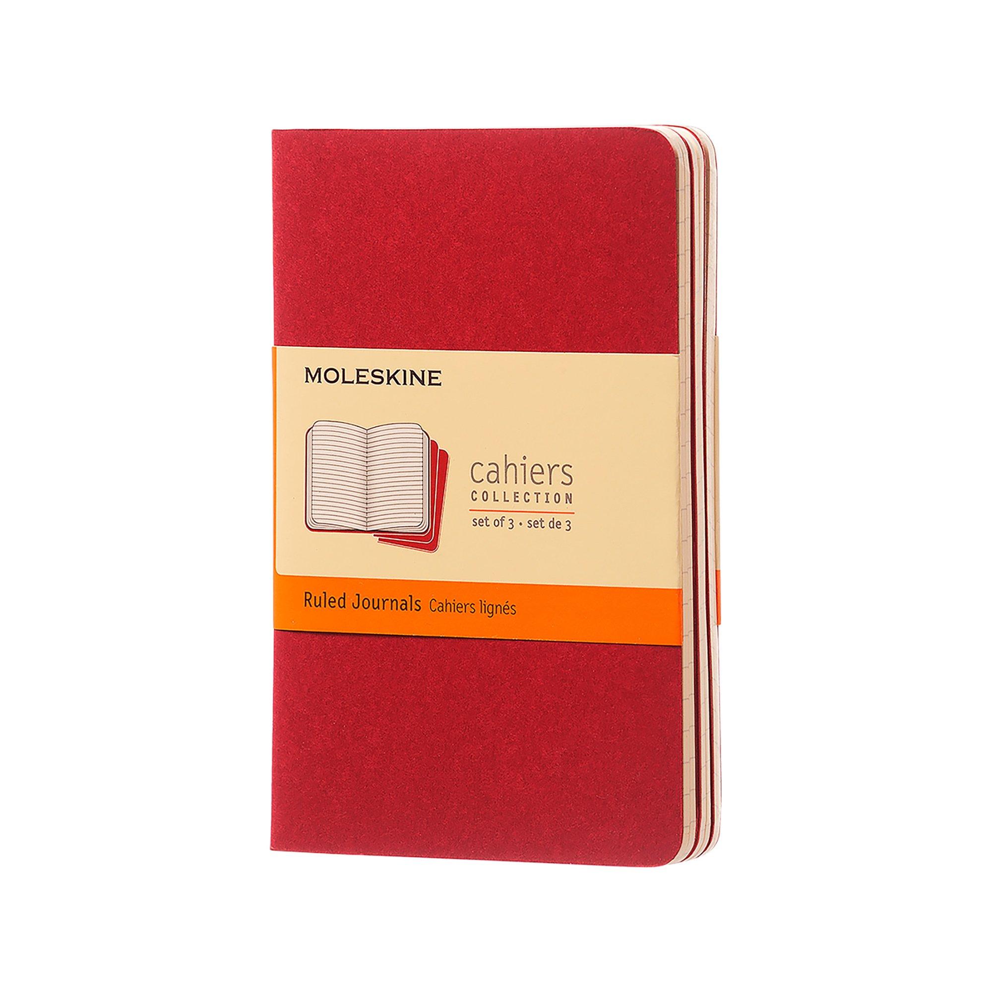 I taccuini hanno una robusta copertina in cartone rosso con cuciture in filo a vista. Le ultime 16 pagine sono staccabili, con un'ampia tasca interna per appunti sciolti e un testo sulla storia di Moleskine. Carta foderata, sbiancata senza cloro. Set di 3