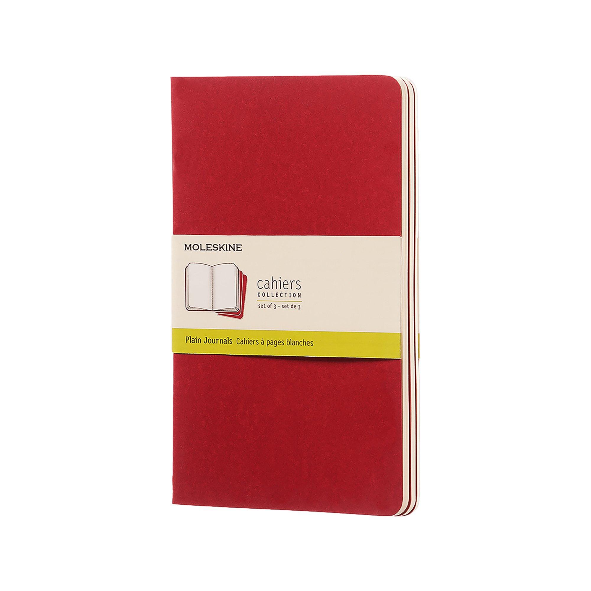 I taccuini hanno una robusta copertina in cartone rosso con cuciture in filo a vista. Le ultime 16 pagine sono staccabili, con un'ampia tasca interna per appunti sciolti e un testo sulla storia di Moleskine. Carta bianca, sbiancata senza cloro. Set di 3