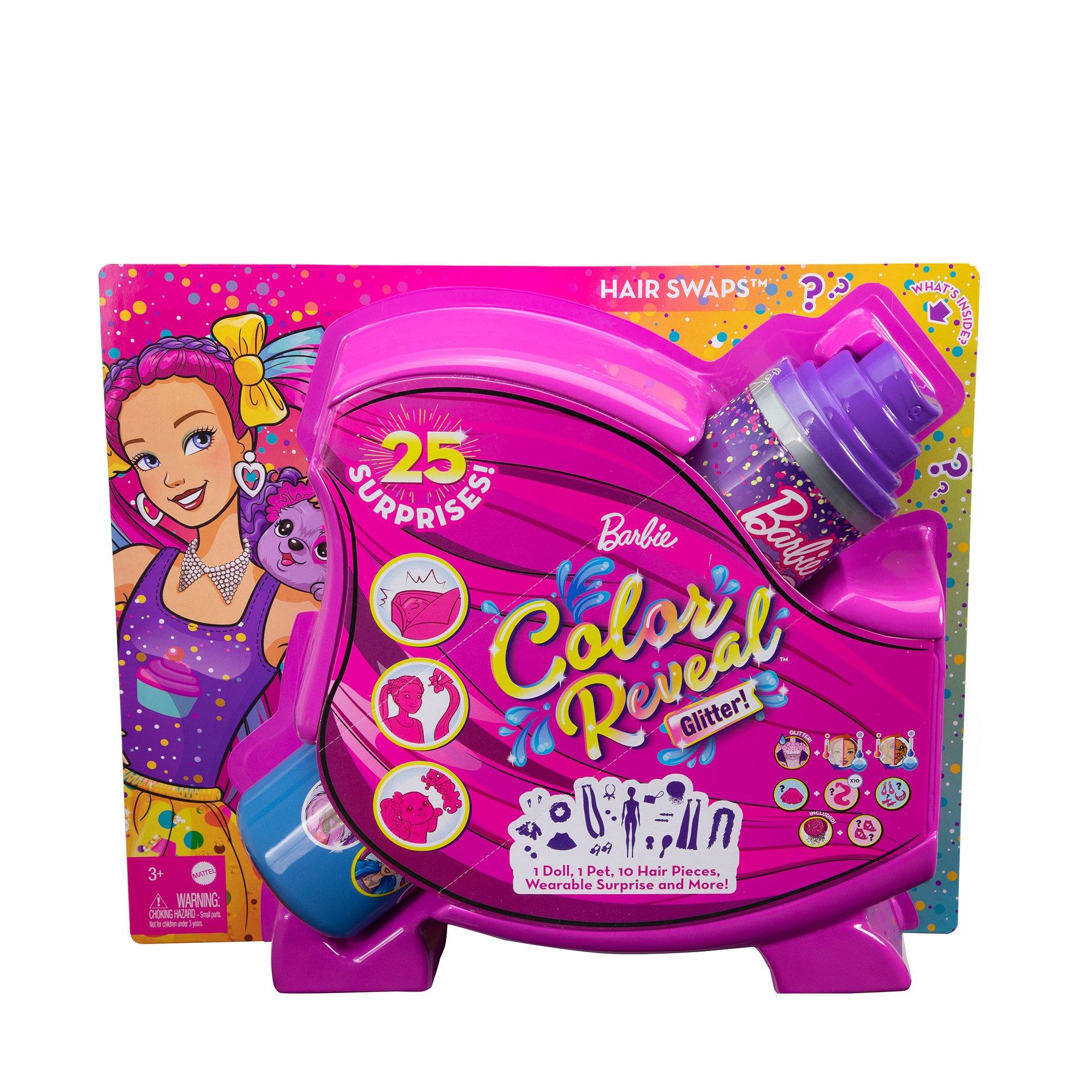 Apri la confezione delle bambole Barbie® Color Reveal™ Glitter! Hair Swaps™ con le sue 25 sorprese è un'esperienza senza eguali: apri la parte anteriore per trovare 15 sacchetti misteriosi che nascondono tante sorprese e un tubo Barbie® Color Reveal™ ispirato a un flacone di spray per capelli! Rimuovi la Barbie® Color Reveal™ ricoperta di glitter rosa dal tubo, riempilo con acqua calda, inserisci la bambola e falla ruotare. L'acqua cambia colore e si riempie di glitter scintillanti per un effetto magico. Quando estrarrai la bambola scoprirai la sua magia! Altre sorprese includono 10 accessori per capelli, un cucciolo, vestiti, accessori, una palla da discoteca con coriandoli e altro ancora. Divertiti a trasformare i capelli con Barbie® e il suo amico cucciolo, usando gli accessori per capelli. Crea un look, poi cambialo. Ci sono tantissime acconciature fantastiche da provare! E le sorprese non finiscono qui... usa un po' di acqua ghiacciata per attivare gli effetti cambia-colore, ad esempio sulle labbra e sugli occhi di Barbie® e sul musetto del cucciolo. Alterna l'acqua calda a quella fredda per ripetere l'effetto cambia colore tutte le volte che vuoi. Ognuna in vendita separatamente, secondo disponibilità. Le bambole non possono reggersi in piedi da sole. Colori e decorazioni possono variare.