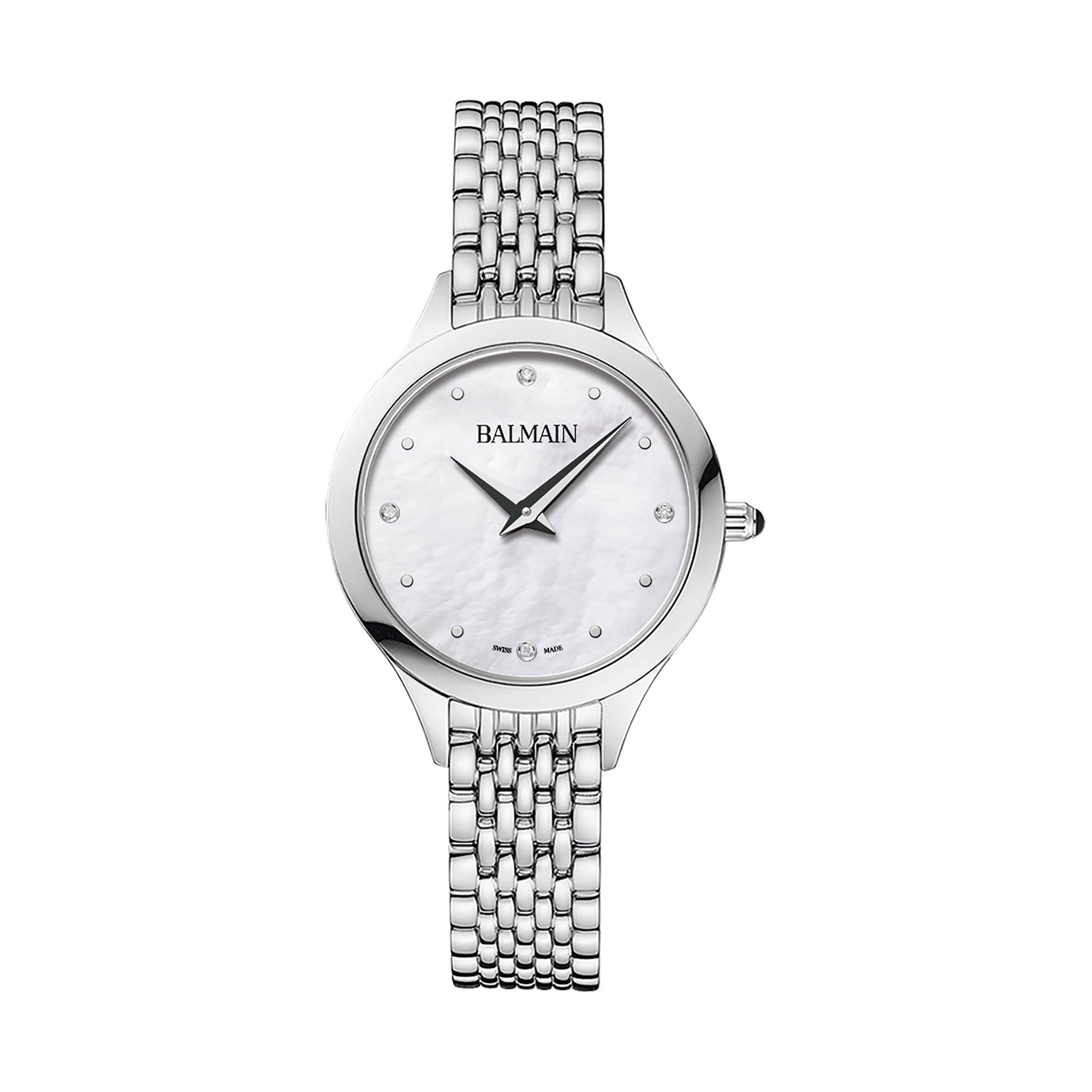 Elegante orologio analogico da donna del marchio Balmain. Il raffinato orologio è dotato di un bracciale a maglie in robusto acciaio inossidabile e di un quadrante minimalista con pietre scintillanti al posto dei classici numeri.