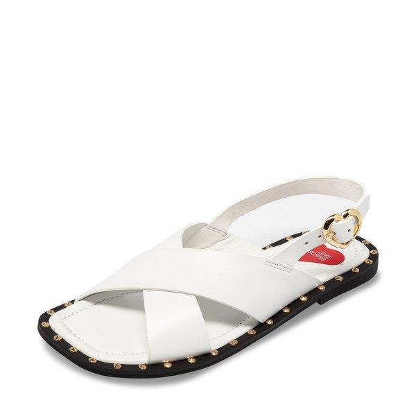 Sandalo piatto in pelle con cinturini incrociati firmato Love Moschino con soletta imbottita, punta squadrata aperta e applicazione di borchie.