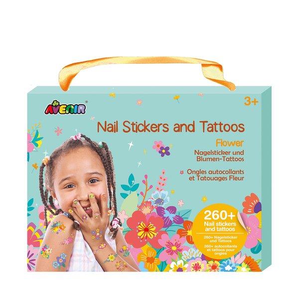 Grandi adesivi per unghie e tatuaggi floreali firmati Avenir. Soggetti vari e colori accesi ispirano i più piccoli e li entusiasmano.