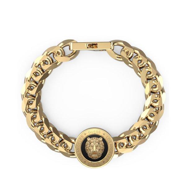 Il bracciale a catena dorato firmato Guess della collezione da uomo Lion King è realizzato in acciaio inossidabile placcato ed è caratterizzato da una magnifica testa di leone su maglie grandi.