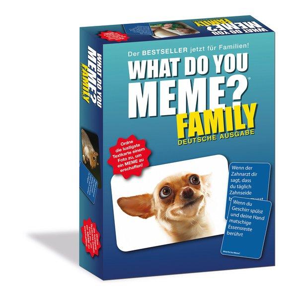Der weltweite Bestseller „What Do You Meme?“ ist jetzt auch familienfreundlich geworden. In der „Family Edition“ gibt es keinen „Ab-18“-Content mehr, dafür aber viele neue Memes und 300 lustige und skurrile Textkarten. Dabei wird die ganze Familie in jeder Partie etwas zum Lachen haben, egal ob man aus der „Generation Meme“ kommt oder nicht.