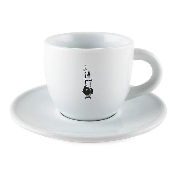 Tazza da cappuccino firmata Bialetti con piattino e stampa iconica del marchio.