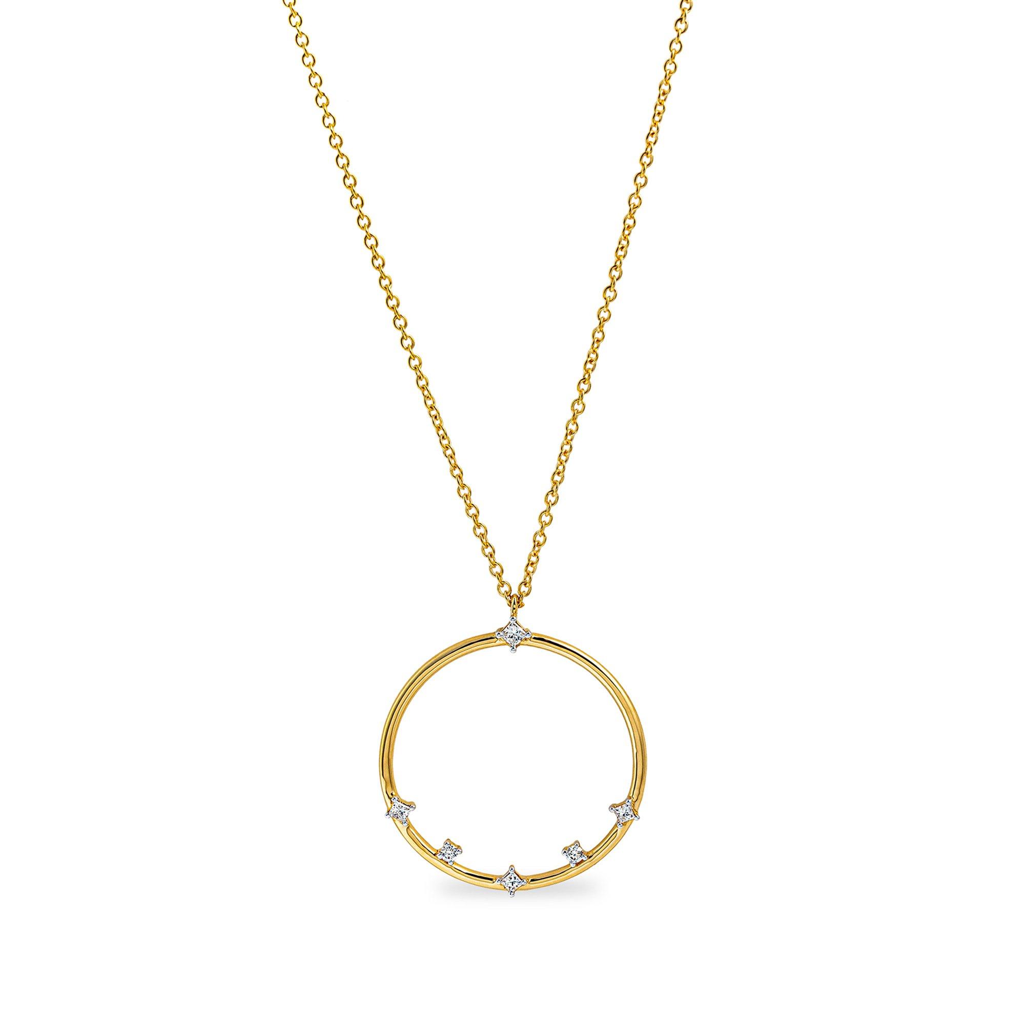 La raffinata catena firmata Sergio Ferris in oro giallo 18 carati sfoggia un design unico. Il ciondolo circolare vanta sei scintillanti diamanti da 0,11 ct con una sobria montatura a griffe.