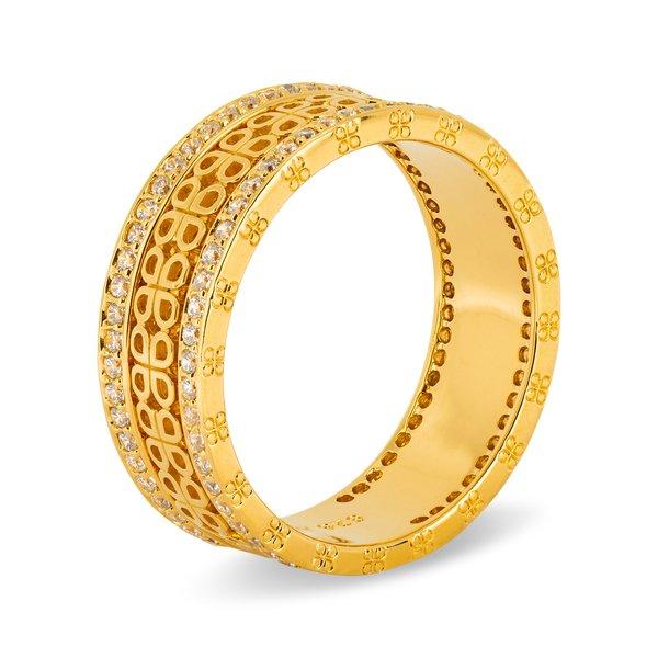 Questo incantevole anello firmato L'Atelier Sterling Silver 925 è realizzato in argento dorato di alta qualità. L'anello ha un motivo filigranato al centro, completato dalle strisce laterali di cristalli scintillanti allineati.