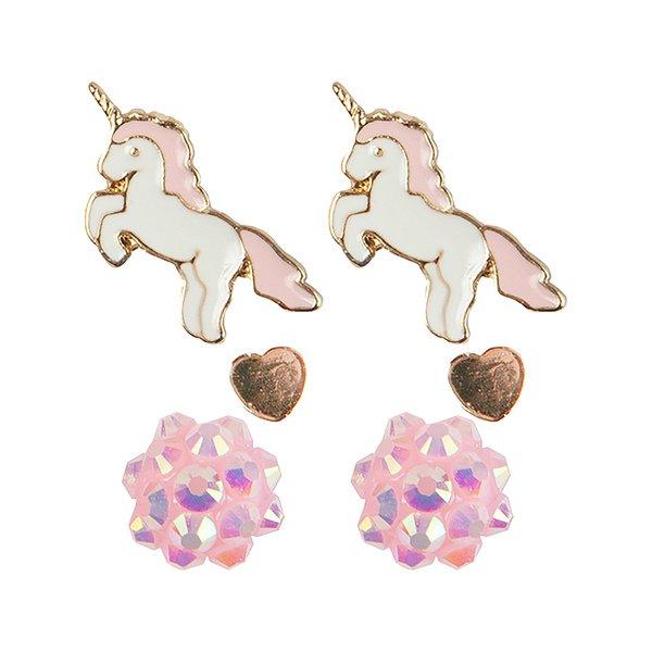 Amanti degli unicorni unitevi! Questo set di 3 include un paio di orecchini a clip con unicorno bianco e rosa, cuori in oro rosa e un paio di orecchini a perno rosa!
