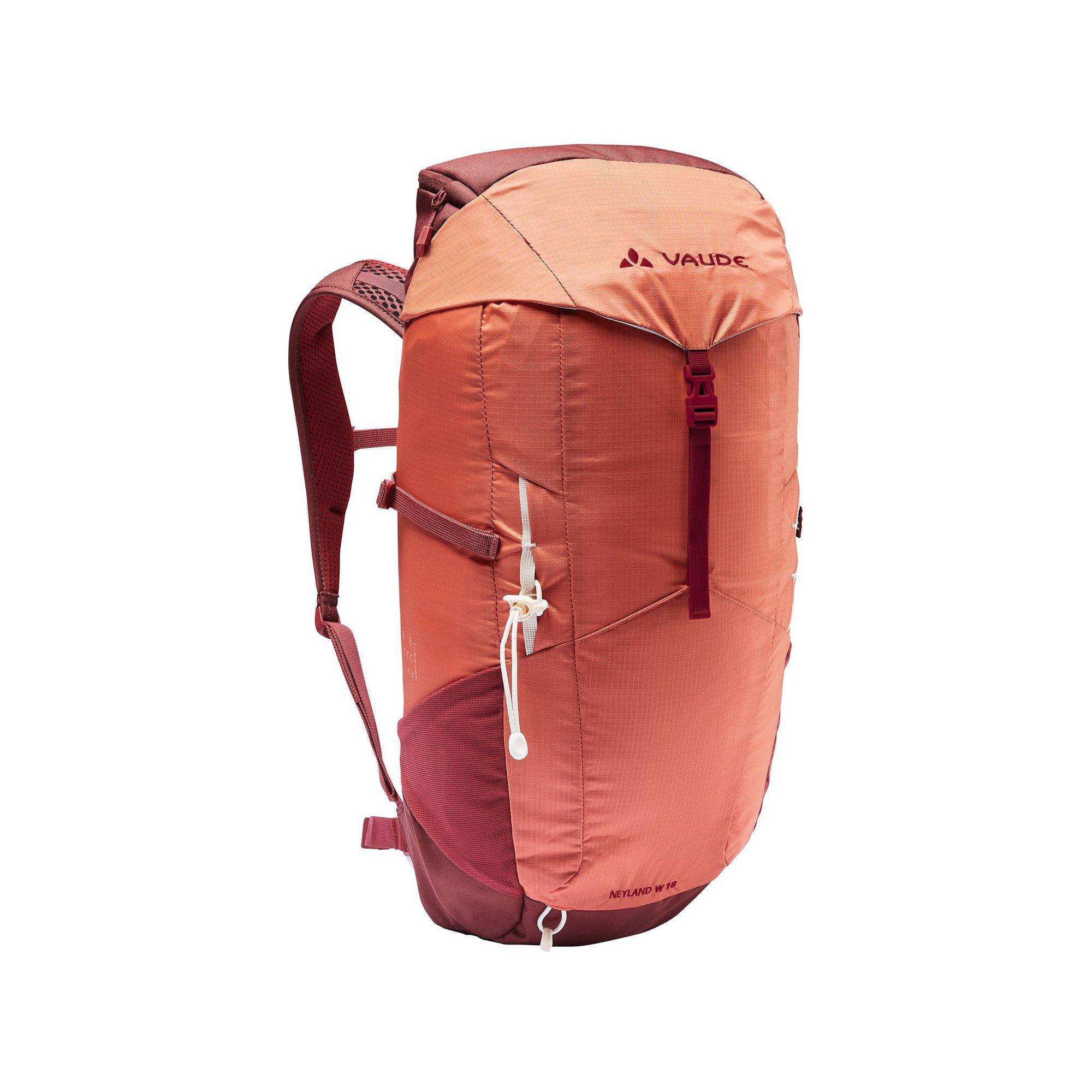 Piccolo zaino da trekking moderno per le donne – gli spallacci e gli stabilizzatori di Neyland 18 sono appositamente adattati all'anatomia femminile. L'innovativo sistema di schienale con moduli strutturati in schiuma dietro la rete garantisce una buona ventilazione e un contatto stabile sulla schiena dall'altra, per consentire allo zaino con caricamento dall'alto di appoggiarsi uniformemente sulla schiena nonostante la ventilazione. La piastra EMP (ergonomic movement panel) integrata supporta la flessione naturale della schiena in salita e allo stesso tempo arresta la pressione del bagaglio sul retro. Il piccolo zaino da trekking da donna ha una patta con scomparto, un ampio scomparto principale, un alloggiamento separato per il sistema di idratazione e un alloggiamento con copertura antipioggia. Le tasche laterali elastiche consentono di riporre una bevanda, un cappello, guanti o altre piccole cose. Un portabastone e cinghie di compressione laterali consentono il fissaggio di bastoncini da trekking e altri bagagli. Women's Neyland 18 è realizzato principalmente con materiale riciclato e a impatto climatico zero: le emissioni derivanti dai materiali, dalla produzione e dal trasporto sono state determinate in modo olistico e sistematicamente ridotte. Le emissioni attualmente inevitabili sono compensate dall'organizzazione indipendente senza scopo di lucro ''myclimate''. Il marchio VAUDE Green Shape garantisce un prodotto ecologico e funzionale realizzato con materiali sostenibili certificati bluesign®.