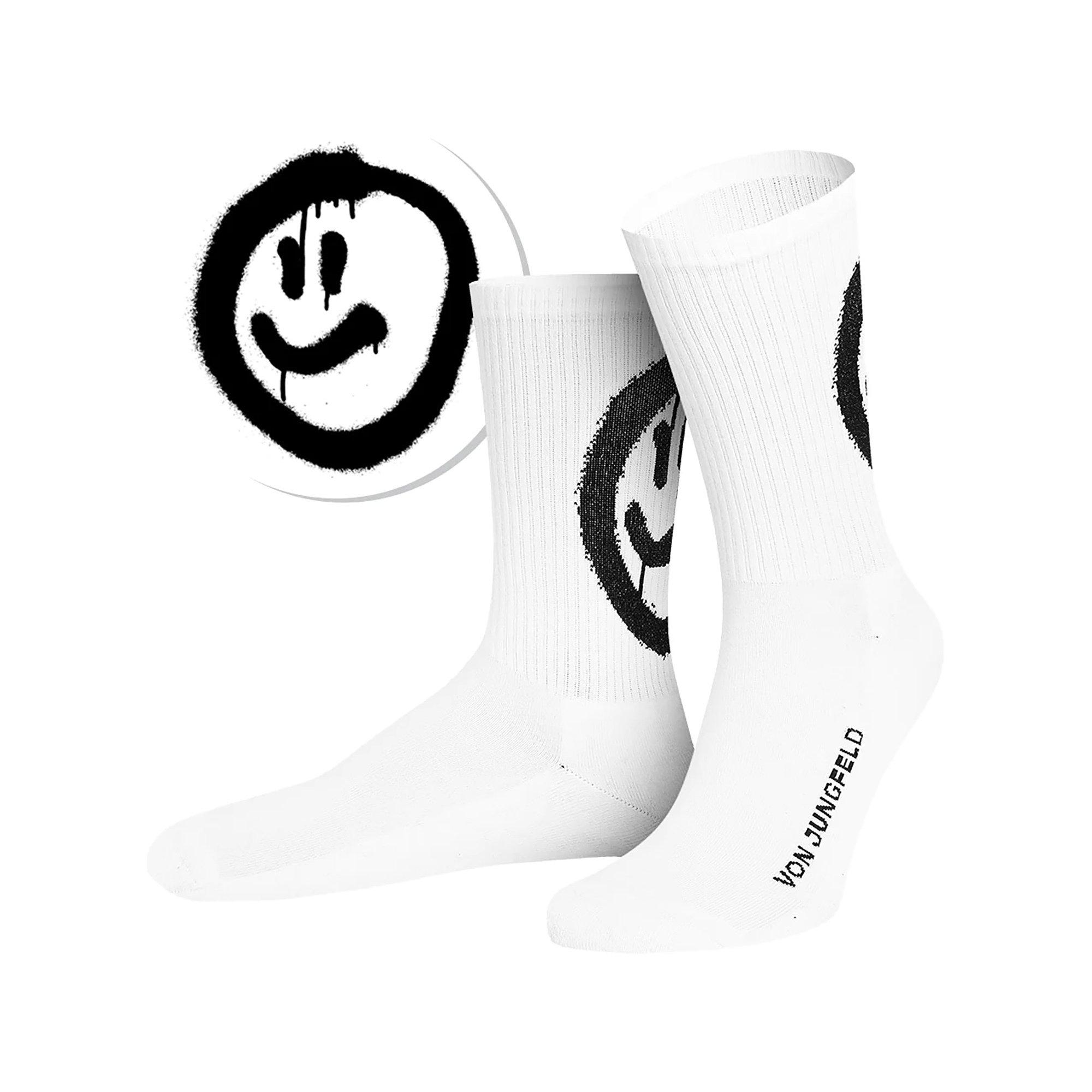Queste calze presentano una distintiva stampa smiley, aggiungendo un tocco giocoso a qualsiasi outfit. Il design include polsini a costine per una vestibilità sicura e confortevole, assicurando che rimangano al loro posto per tutto il giorno. La suola delle calze è adornata con la scritta 'VON JUNGFELD', fornendo un sottile dettaglio di branding.