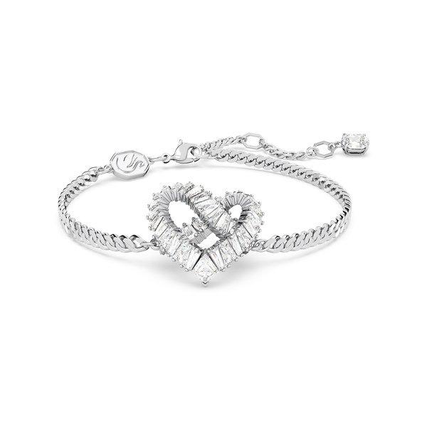 Il look intrecciato di questo braccialetto rodiato è davvero unico. Per ottenere un effetto glamour, il design sfocia in un'elegante forma a cuore, decorata con cristalli trasparenti a taglio baguette. Questo pezzo radioso è indossato su una catena delicata con un singolo elemento rotondo all'estremità. Può essere perfettamente combinato con orecchini o una collana della stessa famiglia. Scegli il pezzo per il tuo portagioie o come regalo perfetto per una persona cara.