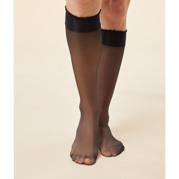 Questi collant al ginocchio offrono un'opzione comoda ed elegante per l'uso quotidiano. Il tessuto velato offre un look discreto, mentre la parte superiore elasticizzata assicura una vestibilità sicura. Il delicato bordo arricciato in alto aggiunge un tocco di eleganza.