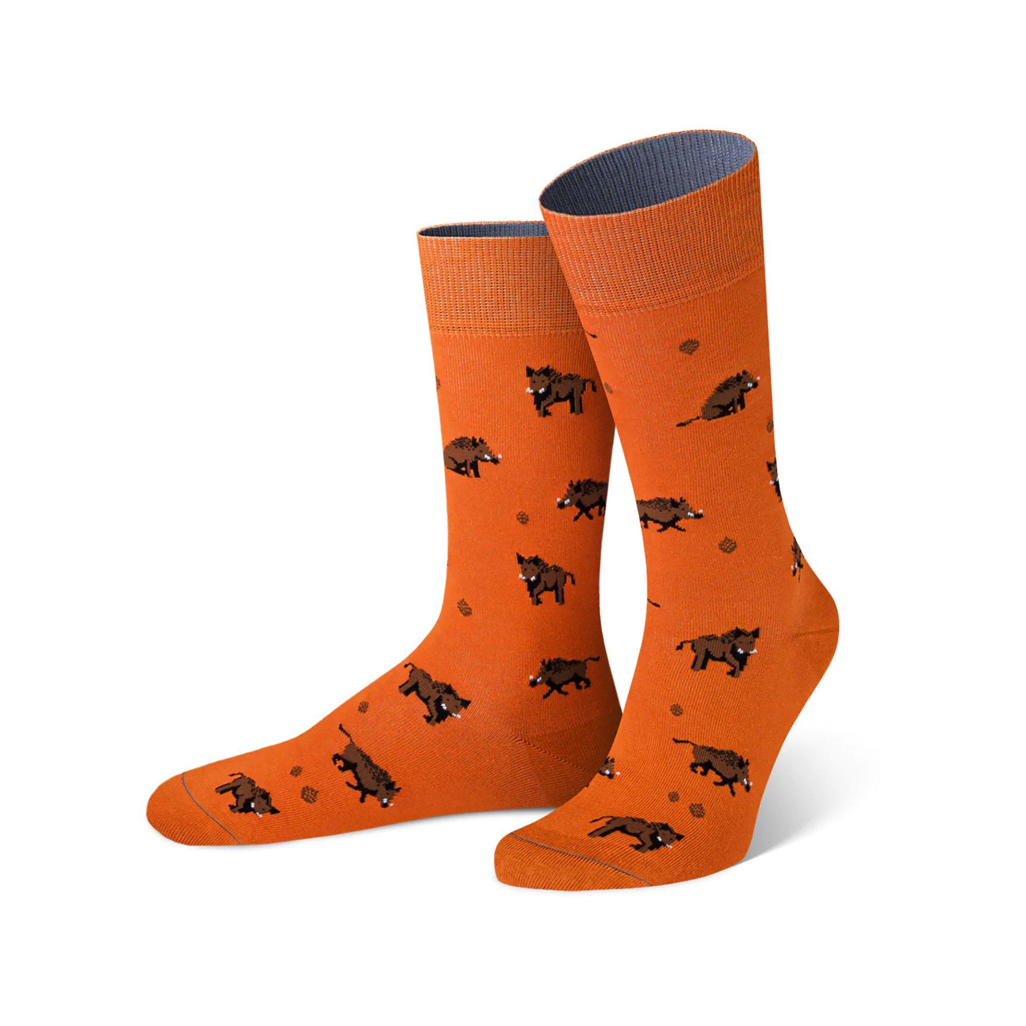 Queste calze classiche presentano un giocoso motivo a cinghiale, aggiungendo un tocco di carattere a qualsiasi outfit. Il vivace colore arancione offre un contrasto sorprendente con i cinghiali marrone scuro, rendendole un accessorio divertente ed elegante.