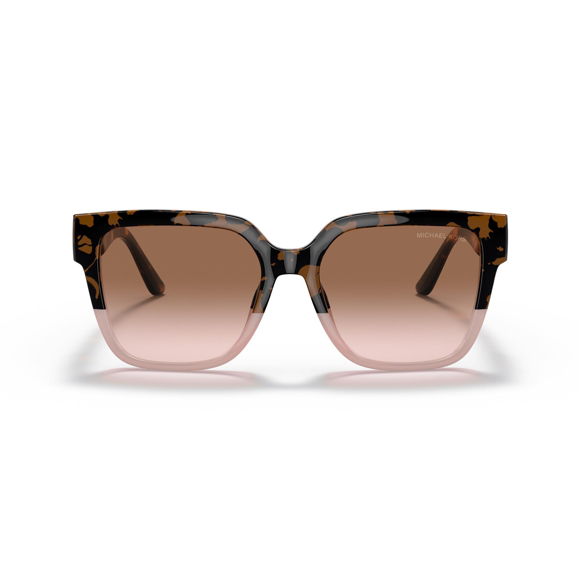 Questi occhiali da sole quadrati presentano un design elegante con una montatura bicolore, che combina un motivo tartarugato sulla metà superiore con un delicato rosa sulla metà inferiore. Le lenti offrono una tinta sfumata, che passa da un marrone più scuro in alto a un rosa più chiaro in basso, fornendo sia stile che protezione solare. Le aste sono adornate con il logo del marchio, aggiungendo un tocco di raffinatezza.
