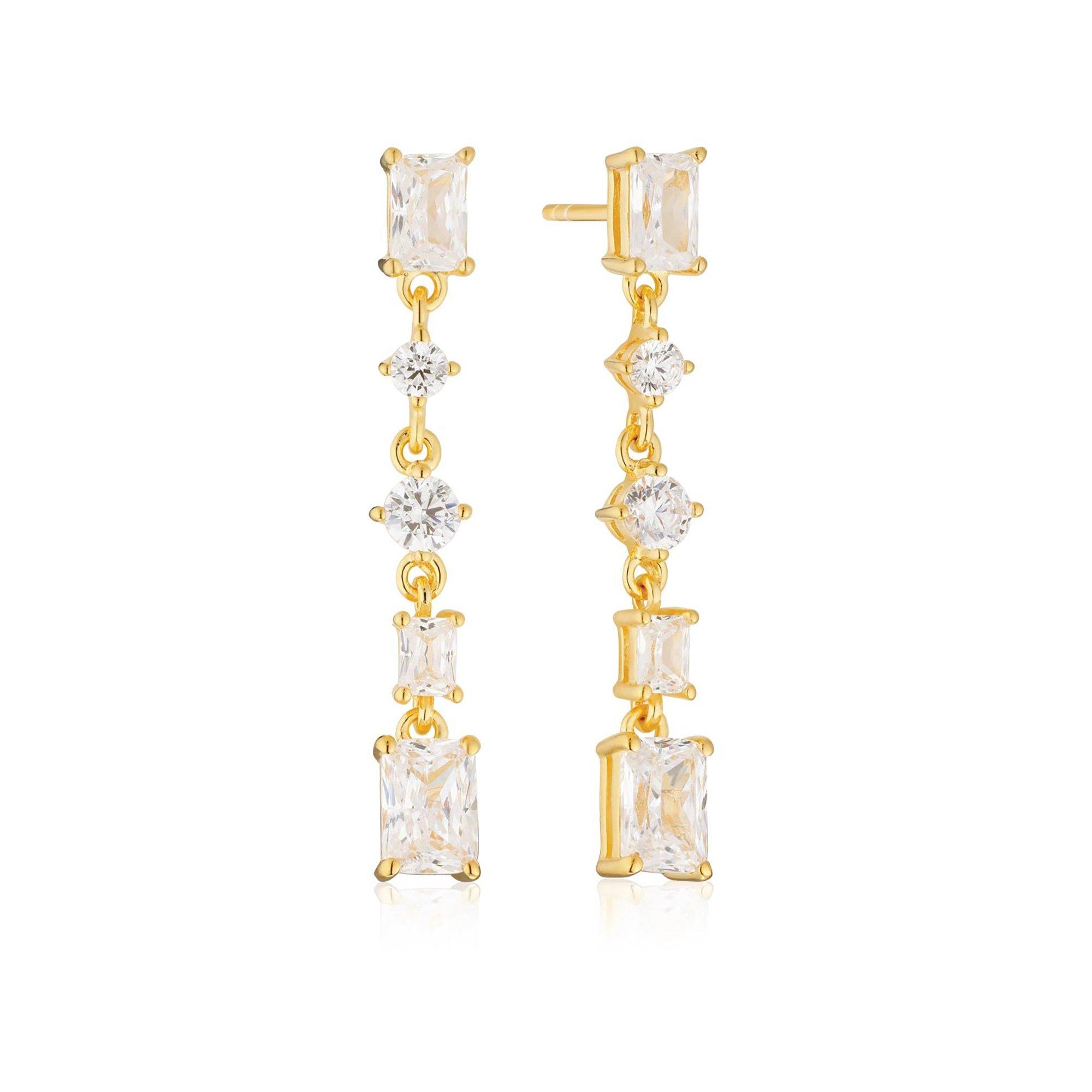 Orecchini in argento sterling 925 placcato oro 18 carati, con superficie lucida e zirconi bianchi incastonati a mano con sfaccettature e taglio smeraldo.