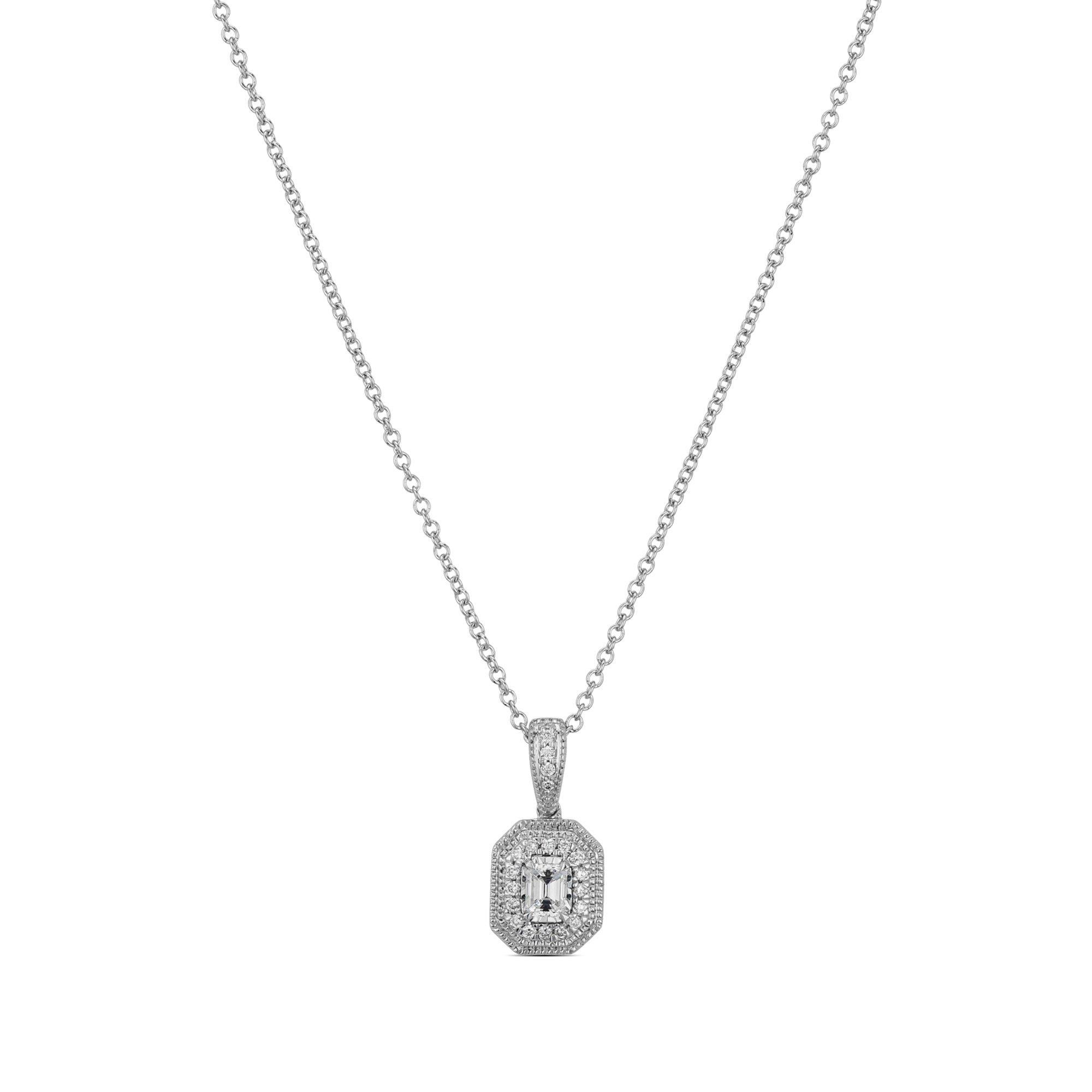 La collana firmata Sergio Ferris propone 21 diamanti (0,18 carati) su un ciondolo in oro bianco con occhiello e crea un insieme scintillante. I diamanti sono disposti su un ottagono allungato. La galleria si erge su una pietra centrale a taglio baguette che forma il centro scintillante.