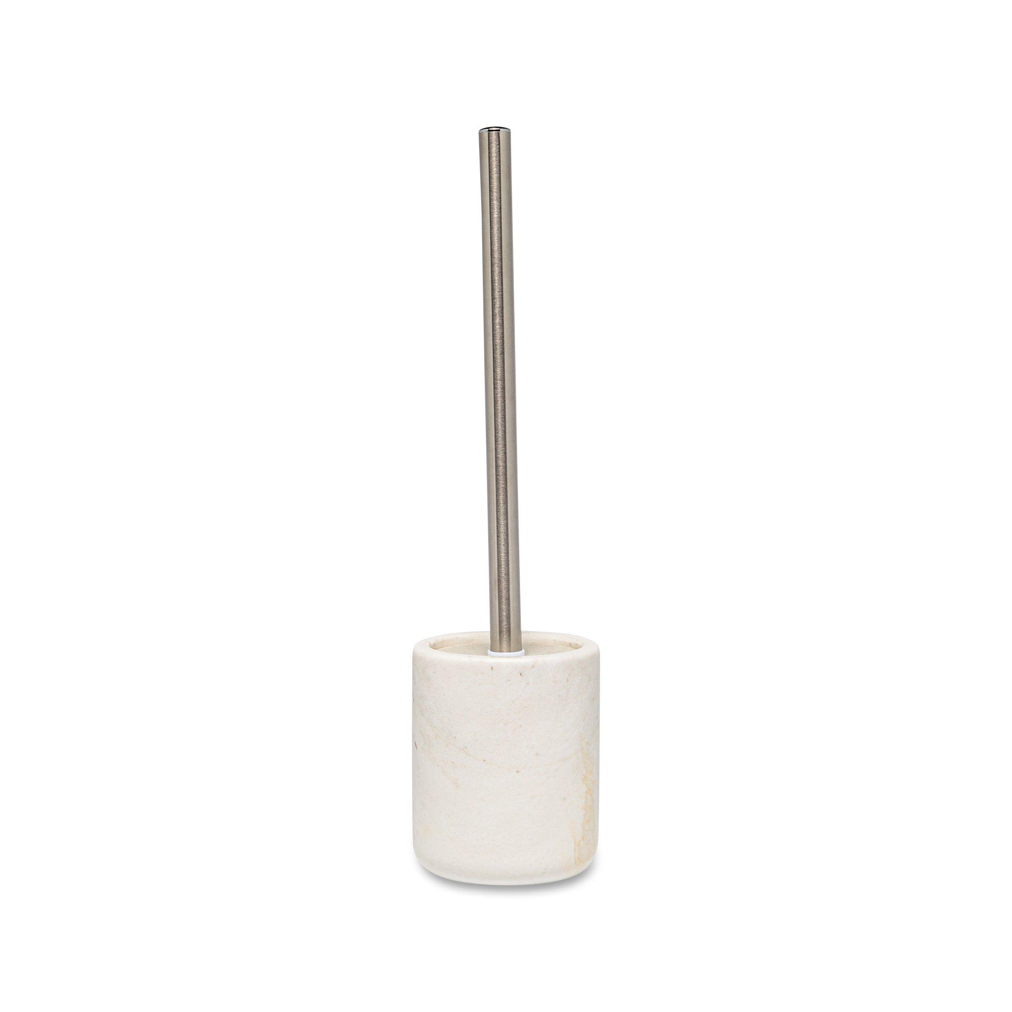 Portascopino tondo smontabile in marmo bianco jazz con manico in acciaio inox opaco, scopino bianco e coperchio in TPR bianco.