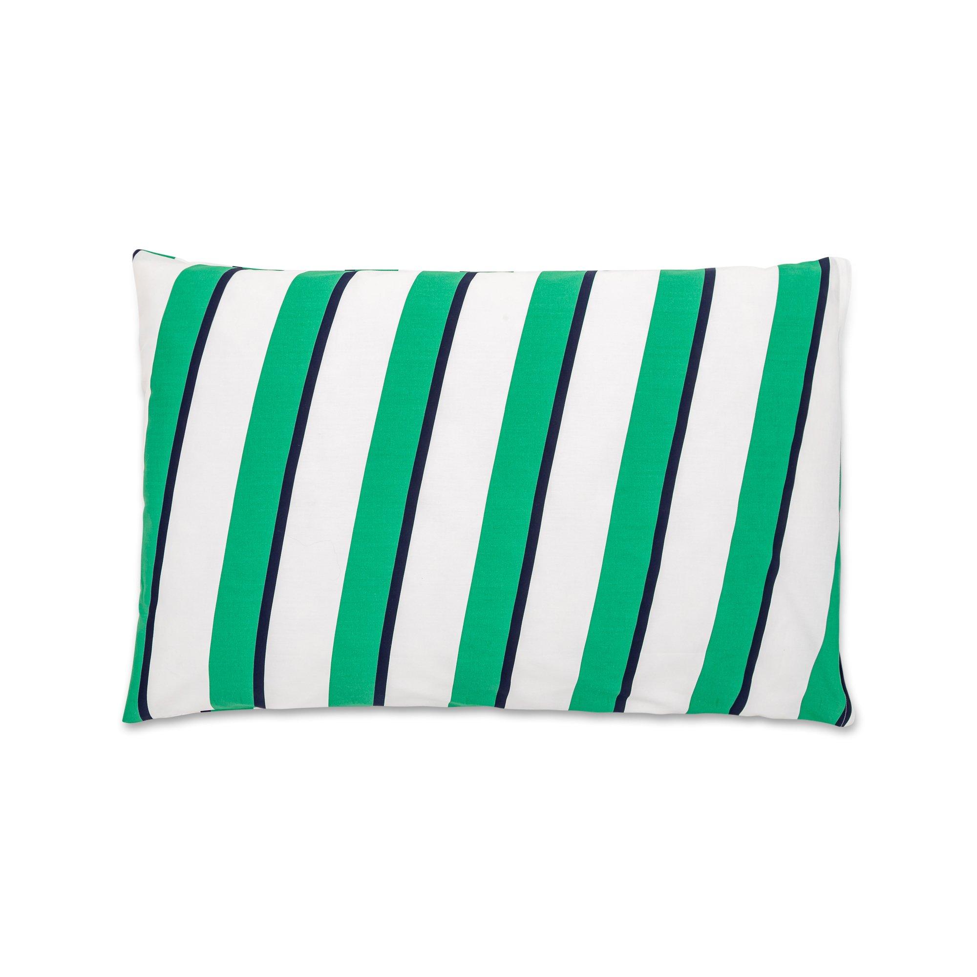 Questa federa presenta un vivace motivo a righe, aggiungendo un tocco fresco ed elegante a qualsiasi spazio abitativo o camera da letto. Il design combina audaci strisce verdi e blu navy con un bianco nitido, creando un contrasto visivamente accattivante.