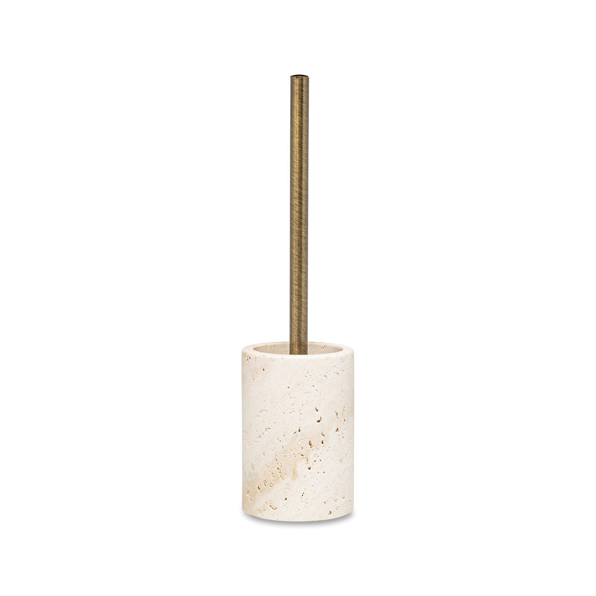Questo set per WC firmato Manor realizzato in travertino bianco con manico in acciaio inossidabile in bronzo antico e spazzola bianca può essere svitato per sostituire facilmente la testina. La raffinata combinazione di materiali garantisce un'estetica e un'atmosfera moderne.